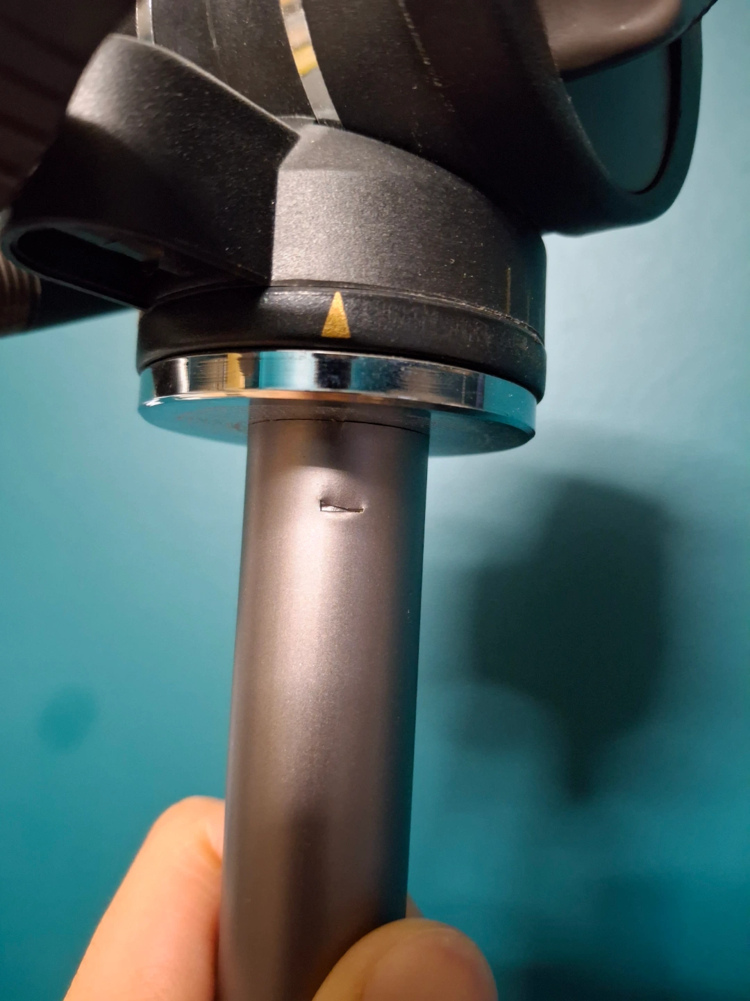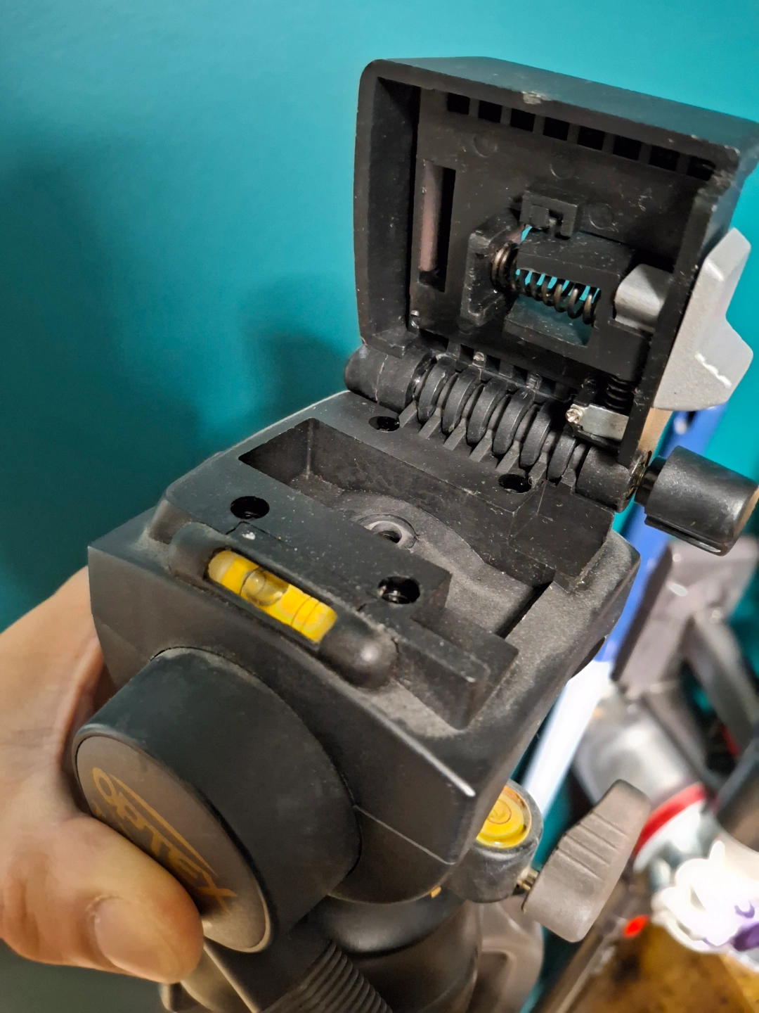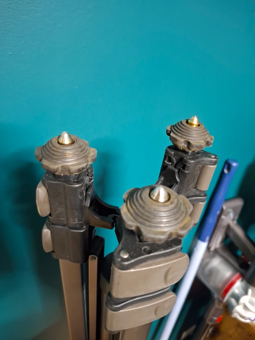 Starts at 25" to 55" with telescopic legs, and finally 65" with the center column. 2 bubble levels and swivel head for panning. Minor wear, but functions fine and smooth.
