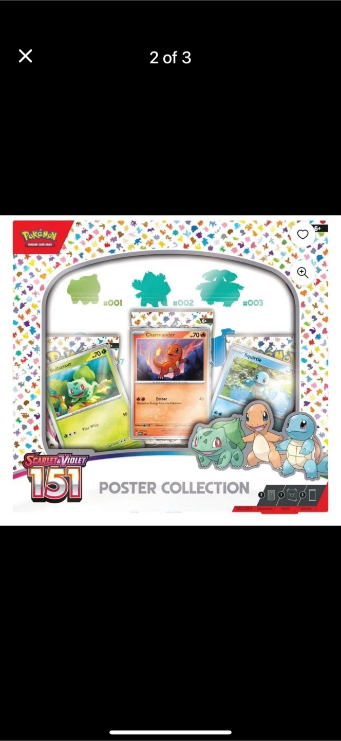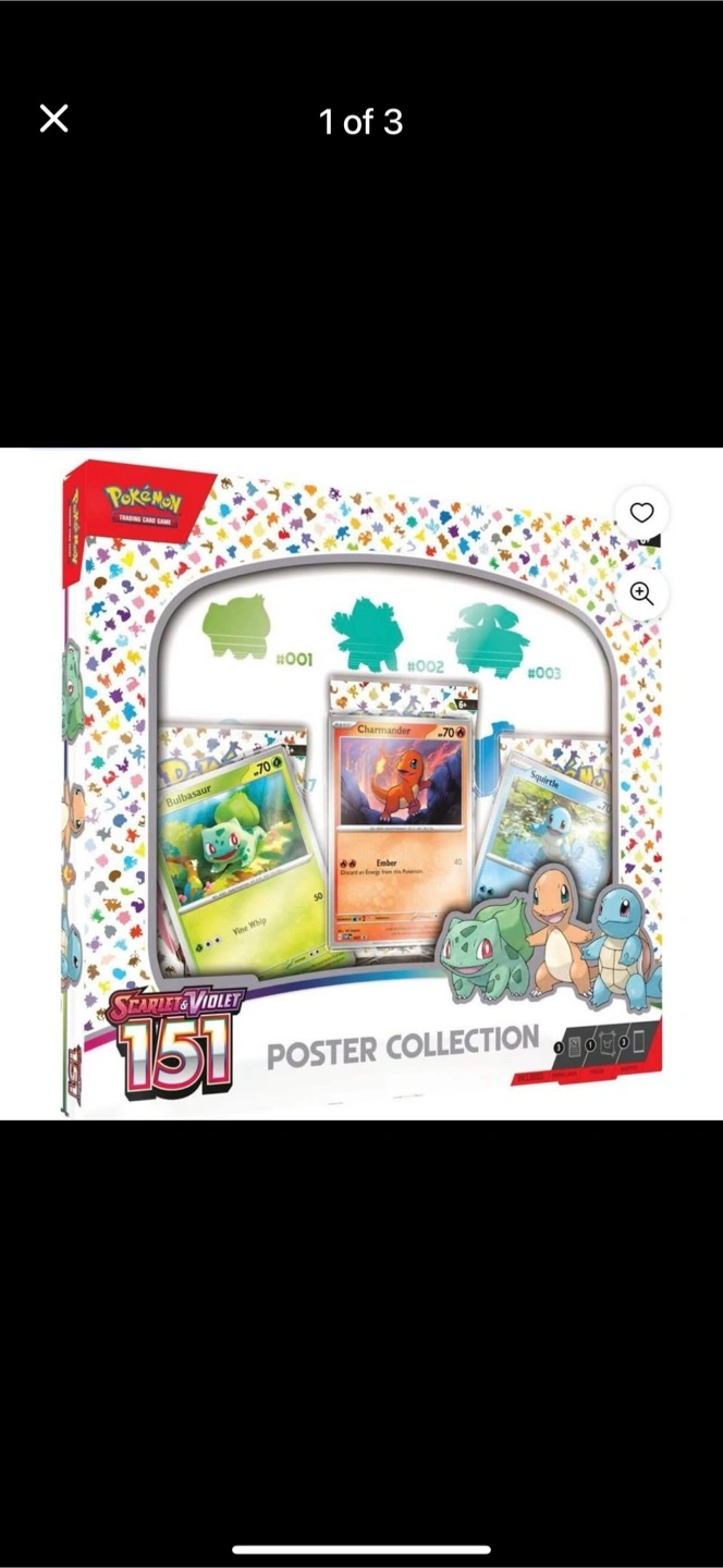 New, sealed Pokémon trading card game poster collection. Features three foil promo cards: Bulbasaur, Charmander, and Squirtle. Includes a collectible poster. Great for collectors or players.