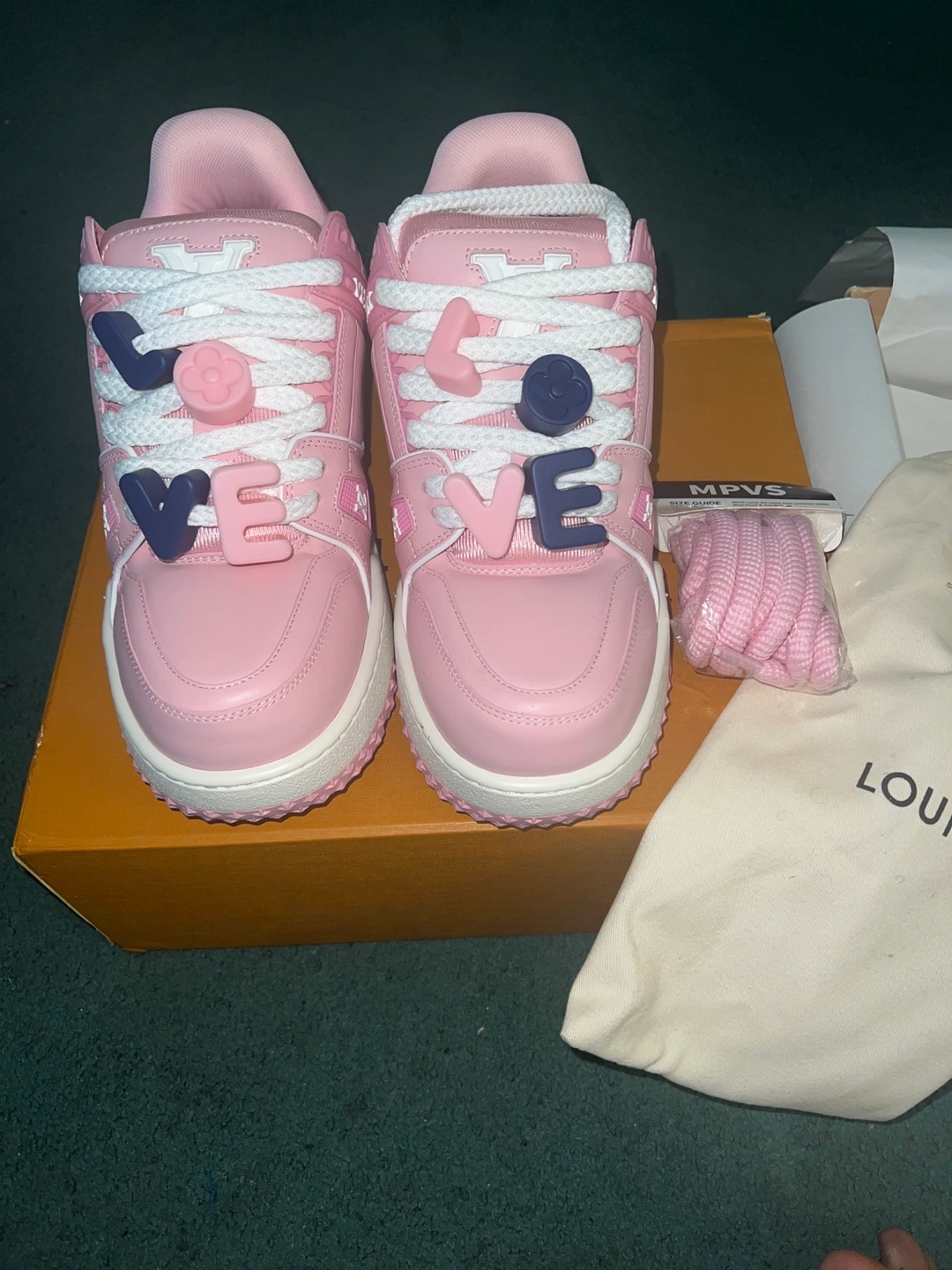 Pink leather sneakers. White laces and sole. Unique LV branding. Comes with dust bag and box. Size 39-40 it comes with extra pink lace