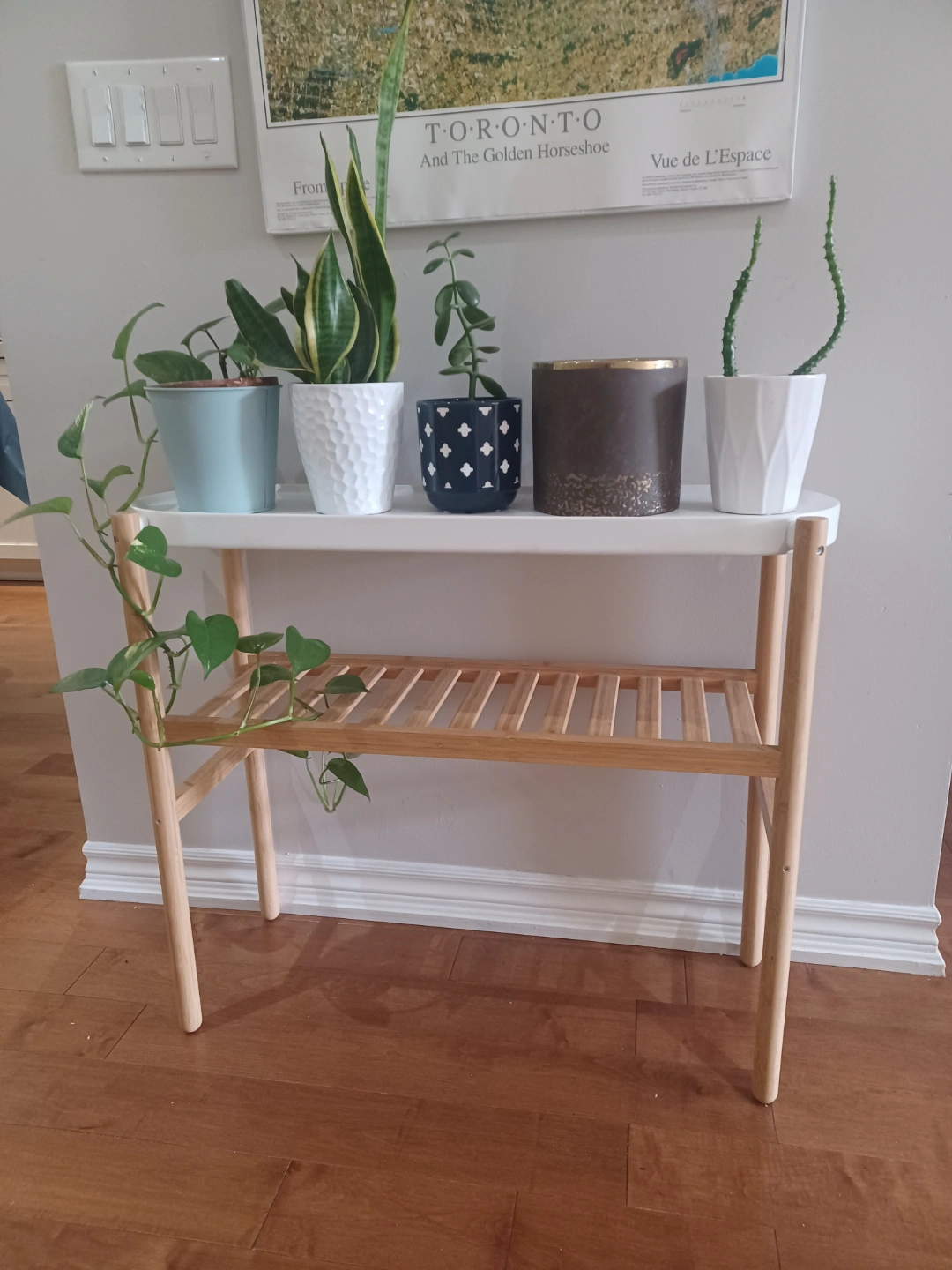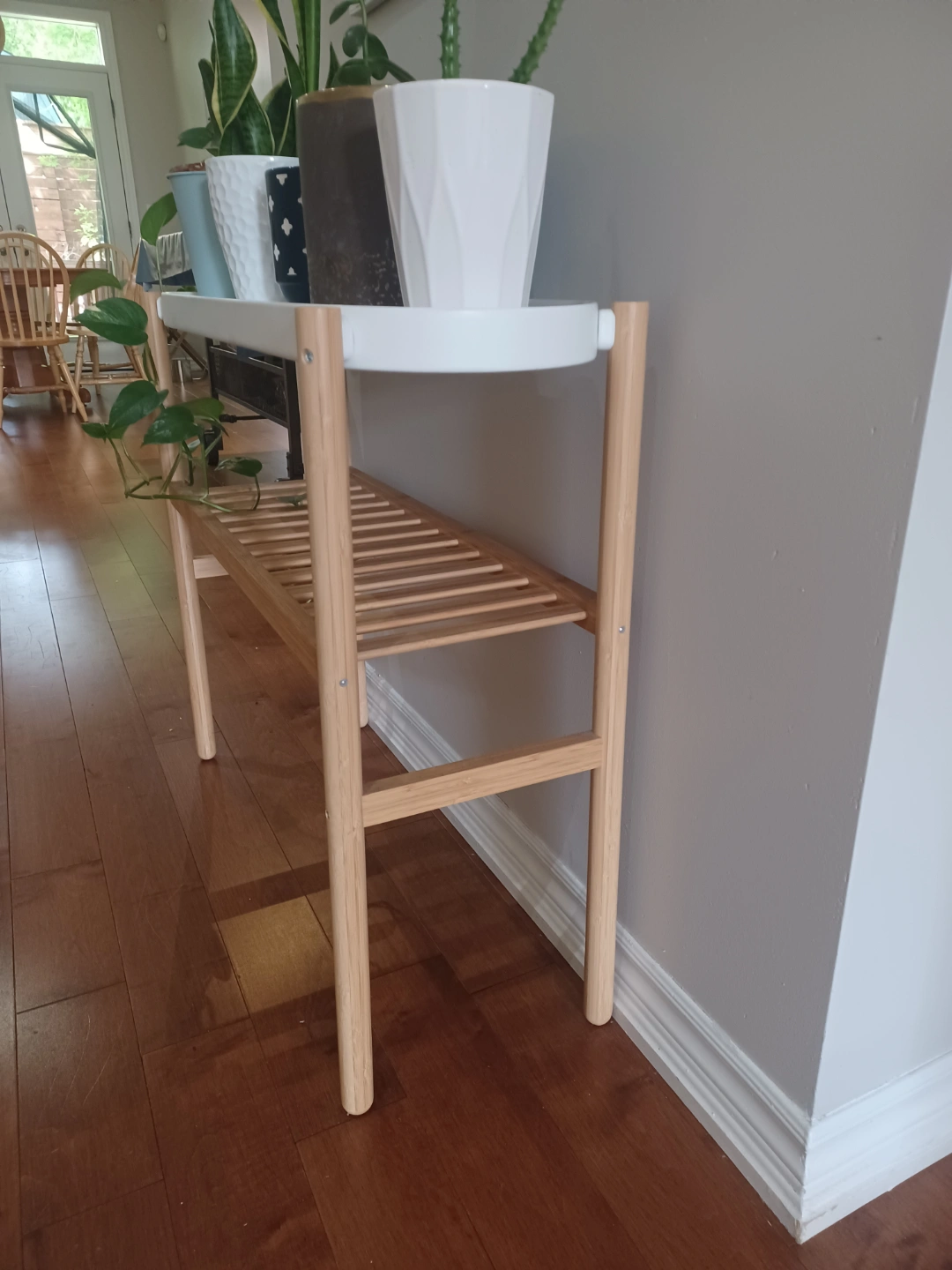 White top shelf and bamboo lower shelf. Ideal for plants or other small items.