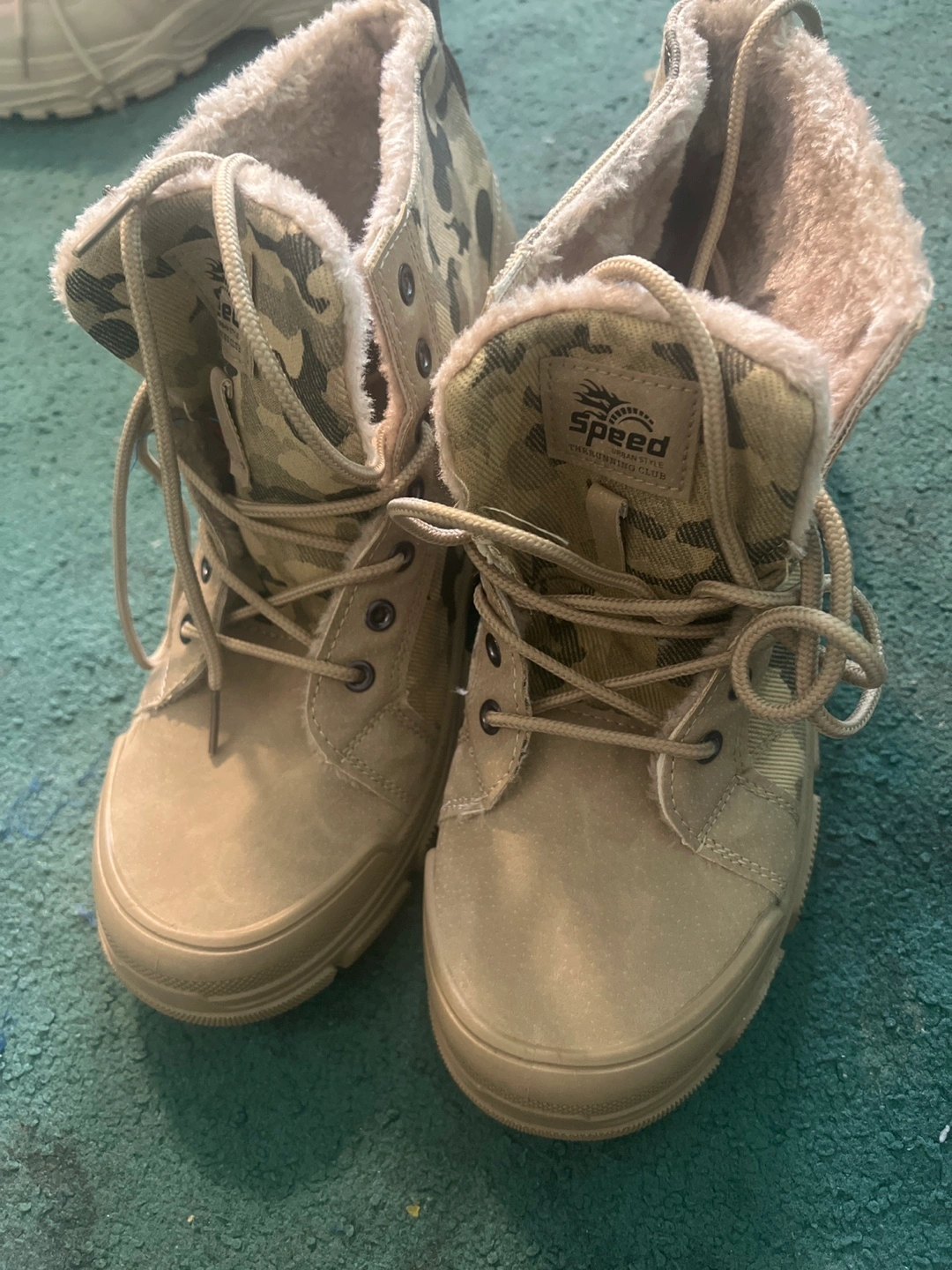 Men’s high-top winter boots. Camo print fabric and suede-like material. Faux fur lining. Lace-up closure. Chunky sole. Good for cold weather. Never worn