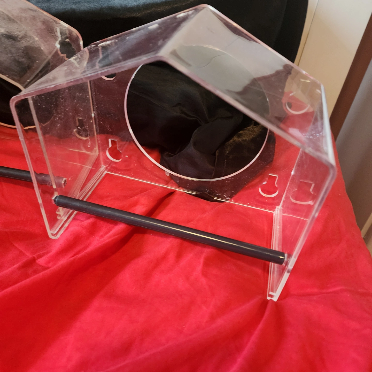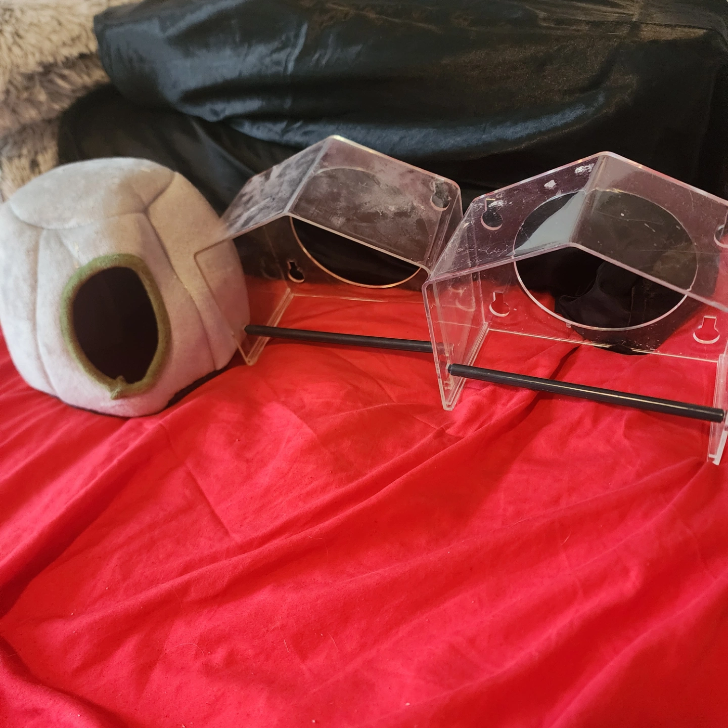 146Two clear acrylic houses for small animals. Each has a small perch. Also included is one grey plush hidey-hole. Ideal for hamsters, mice, or other small pets.$5 each