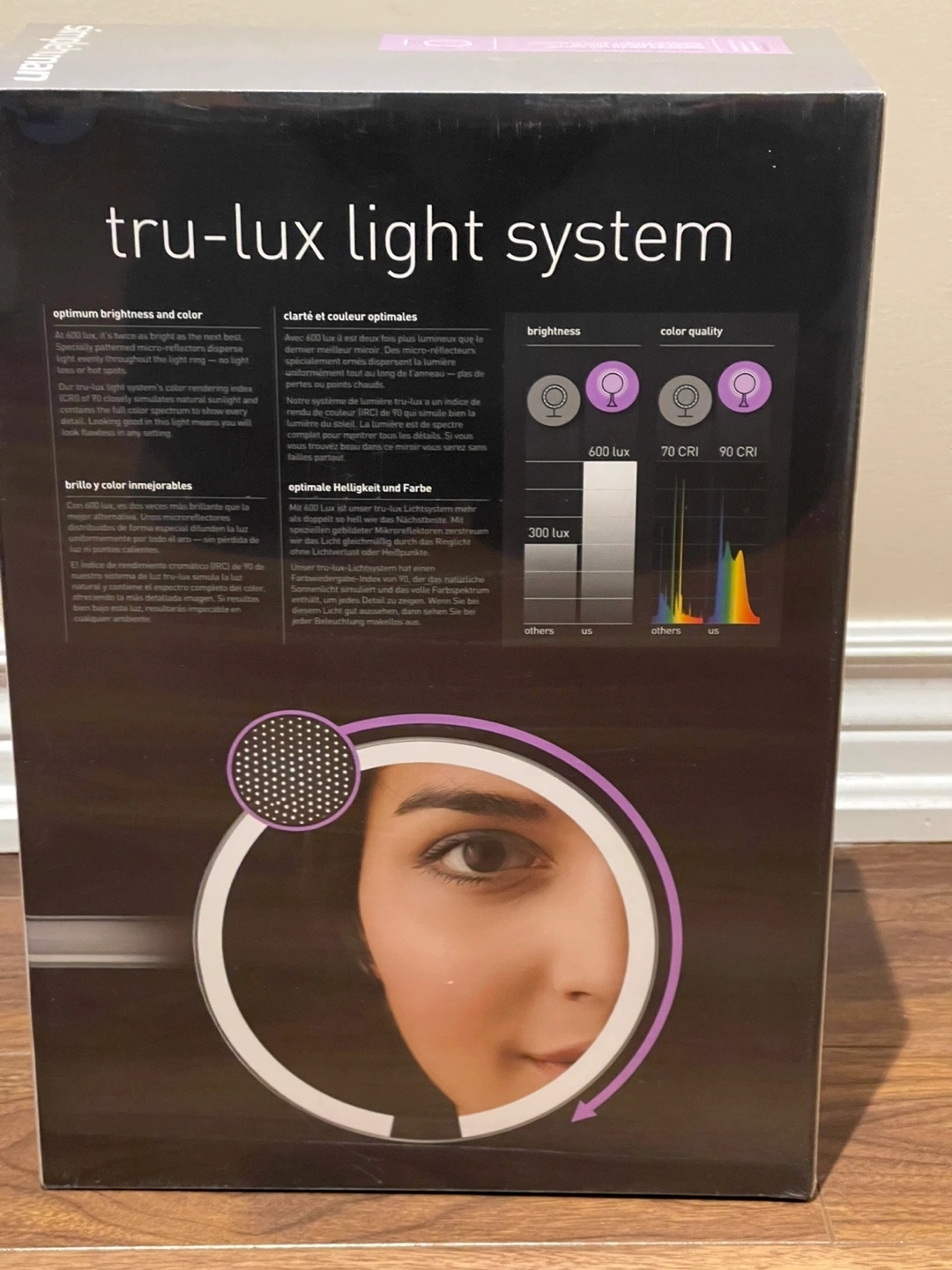 Lights up automatically as your face approaches. Tru-lux light system simulates natural sunlight, allowing you to see full color variation, so you'll know when your makeup is color-correct and flawless. Sturdy stainless-steel telescopic swing arm provides smooth, effortless adjustability. Mounts directly onto the wall and works with standard junction boxes. 5x magnification is ideal for providing exceptional detail while still allowing you to see your entire face at once.