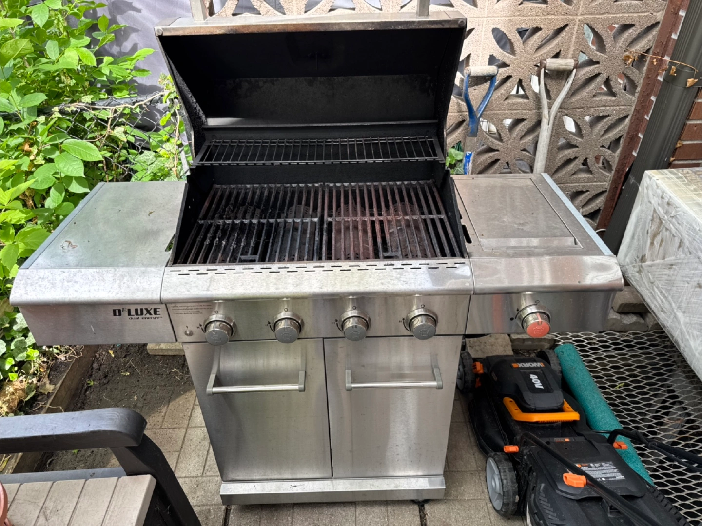Stainless steel propane BBQ. Four burners. Side burner. Used condition. Shows some signs of wear.