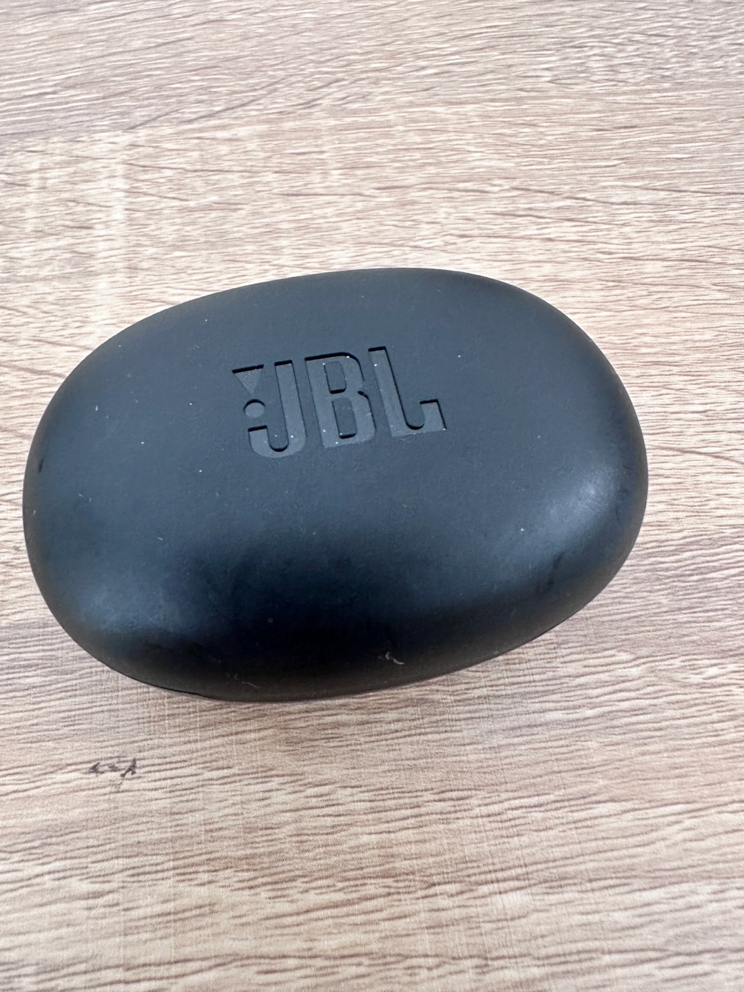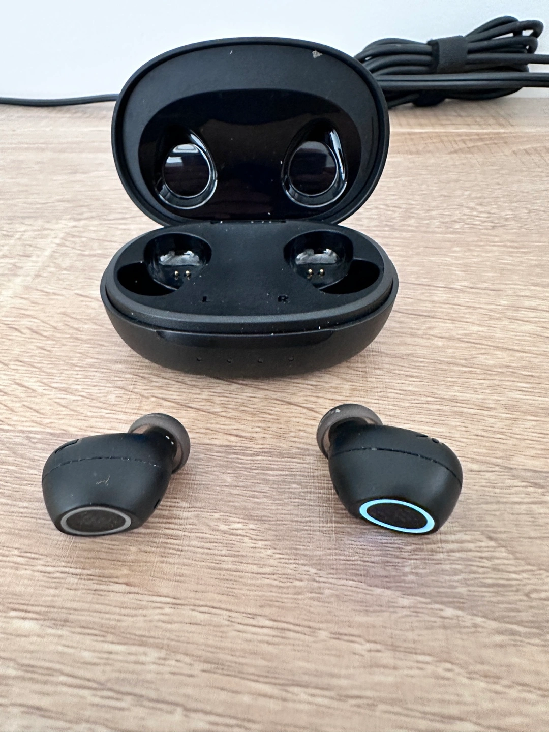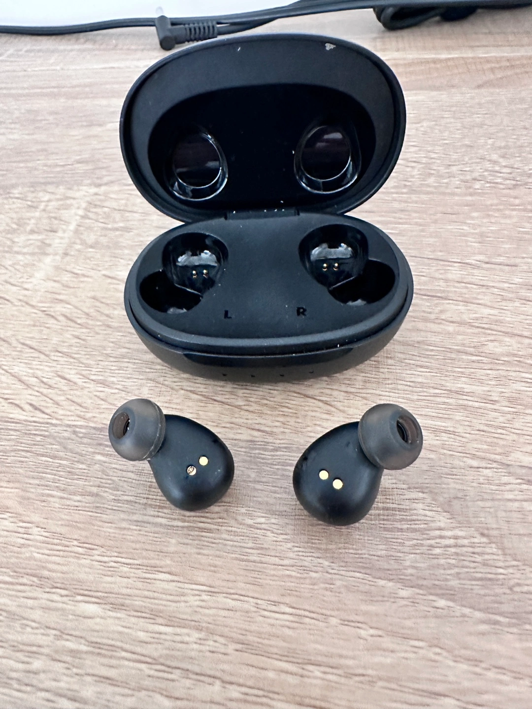 63Wireless earbuds with charging case. Black. Includes charging cable.