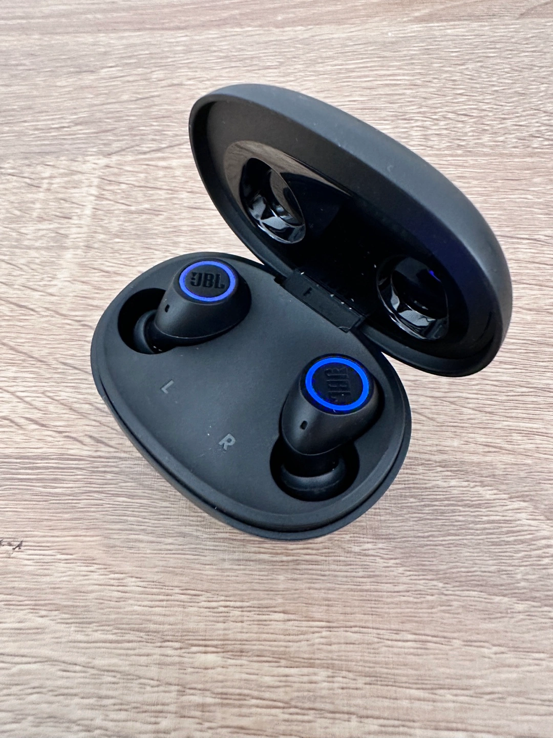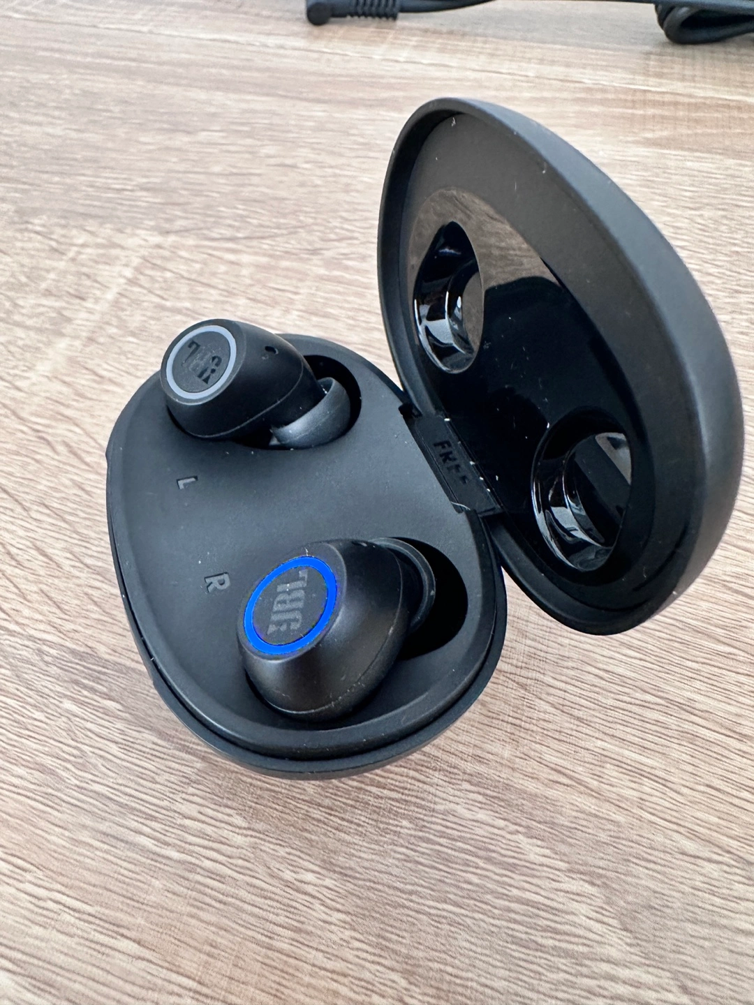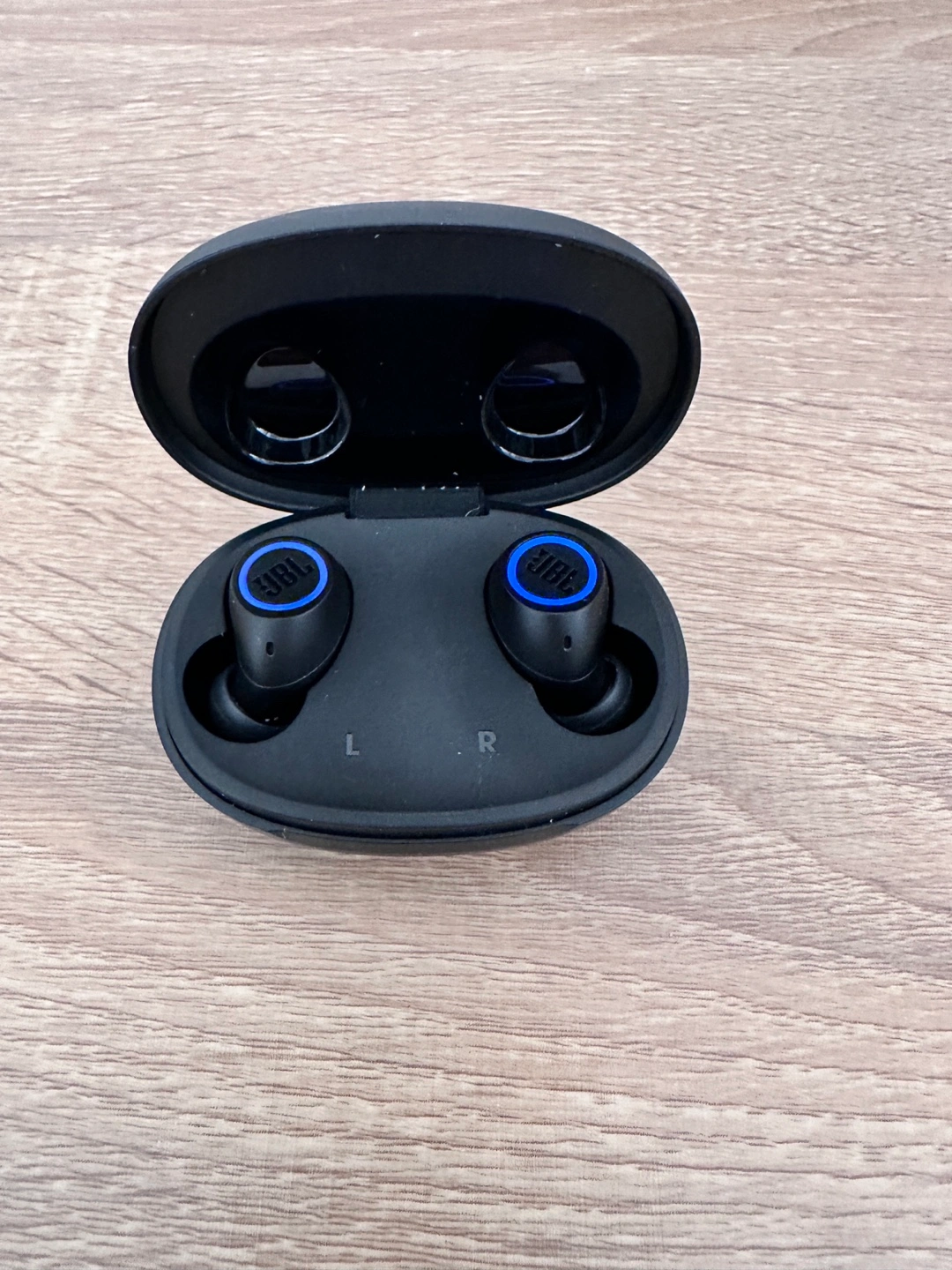 63Wireless earbuds with charging case. Black. Includes charging cable.