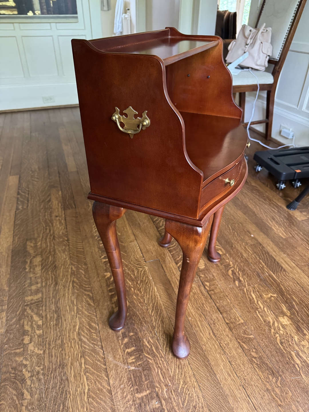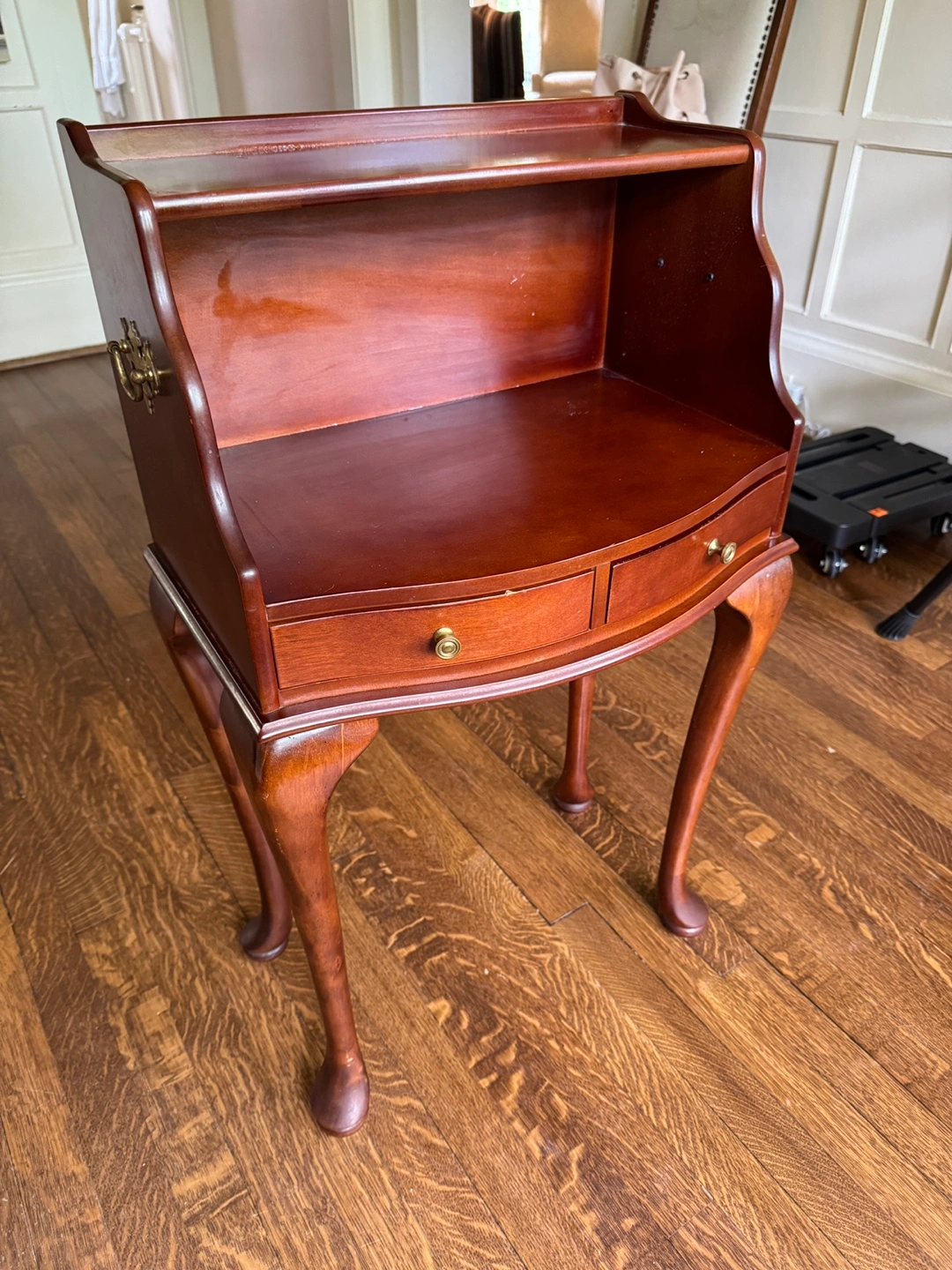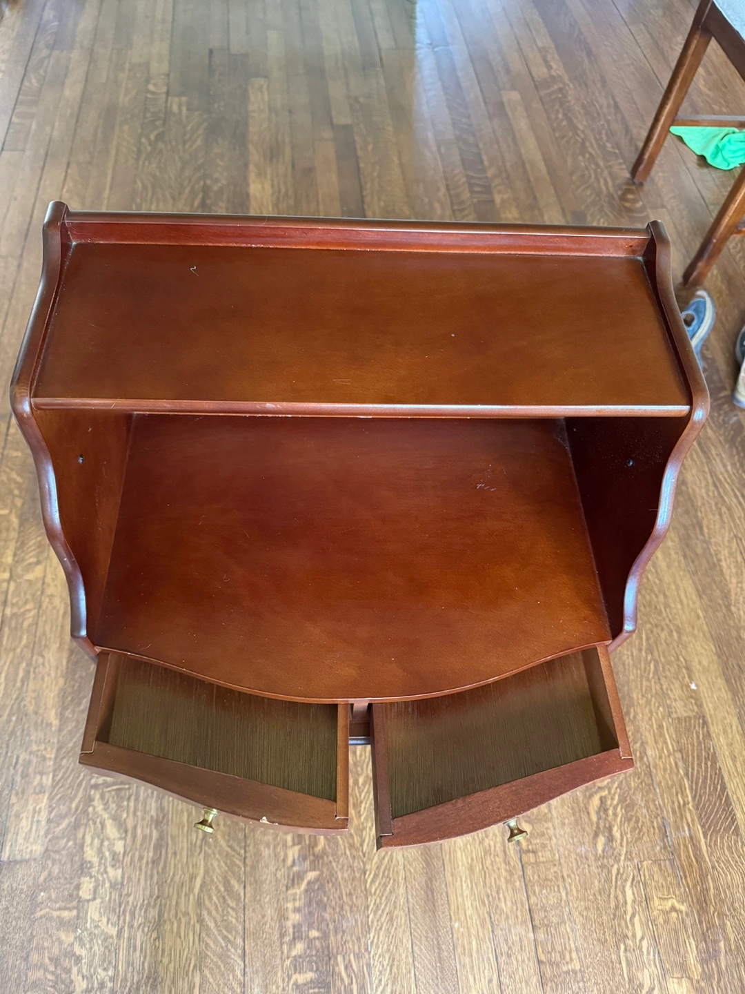 Used Bombay accent table / end table. Features two drawers and a small shelf. Cabriole legs.