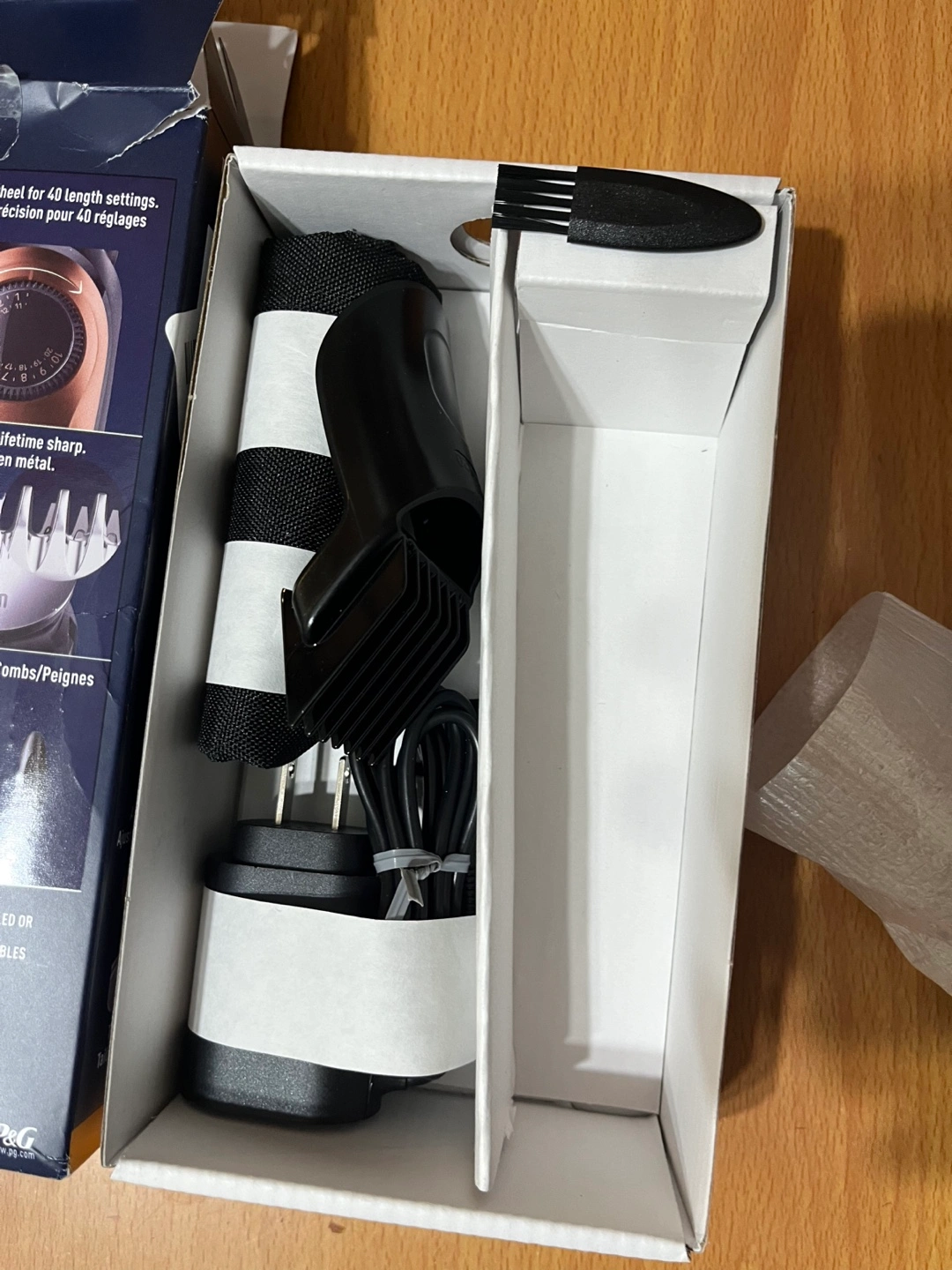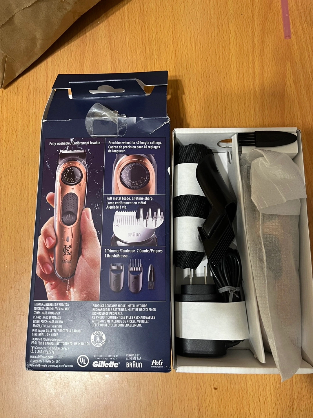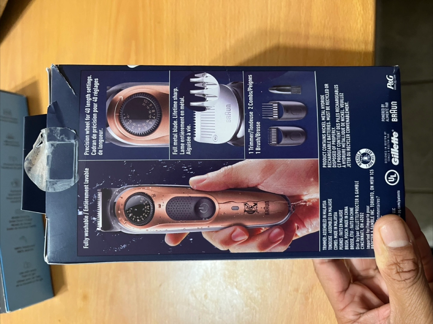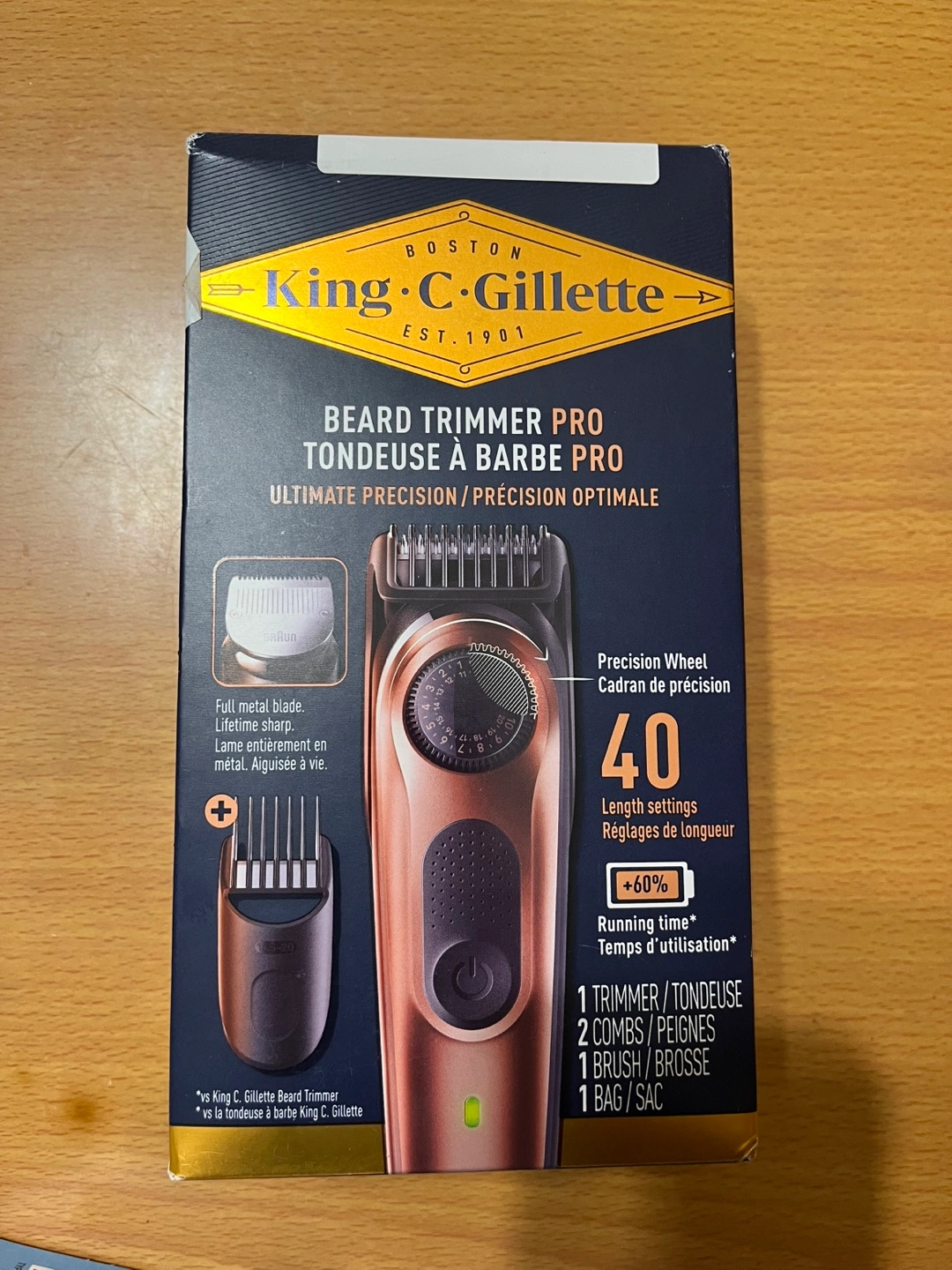 New beard trimmer. Rose gold colour. Features a precision wheel for 40 length settings. Full metal blade. Includes 2 combs, 1 brush and a carrying bag. Rechargeable.