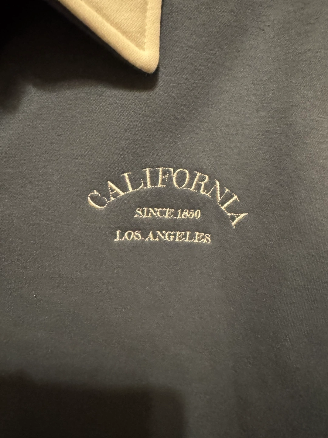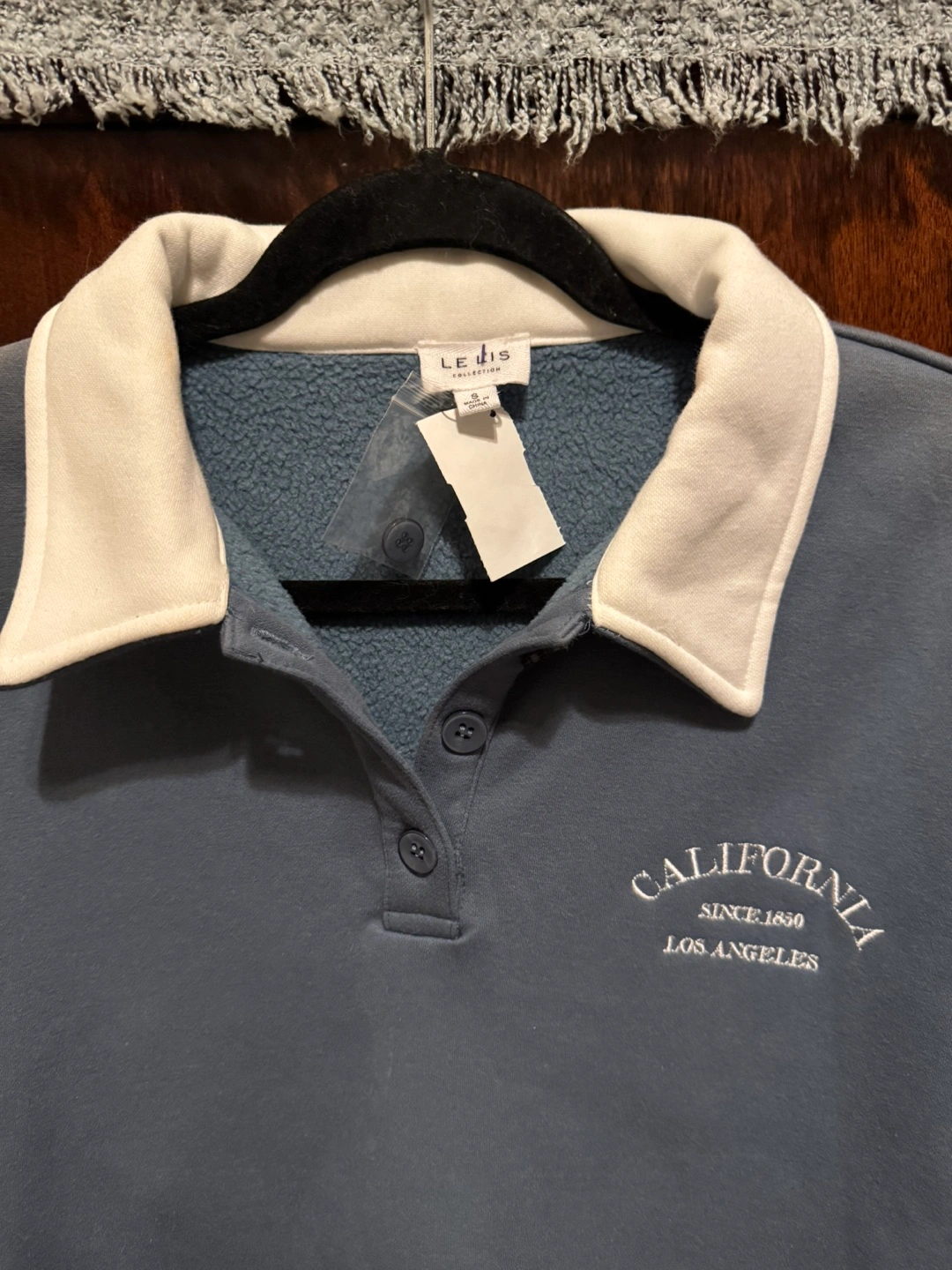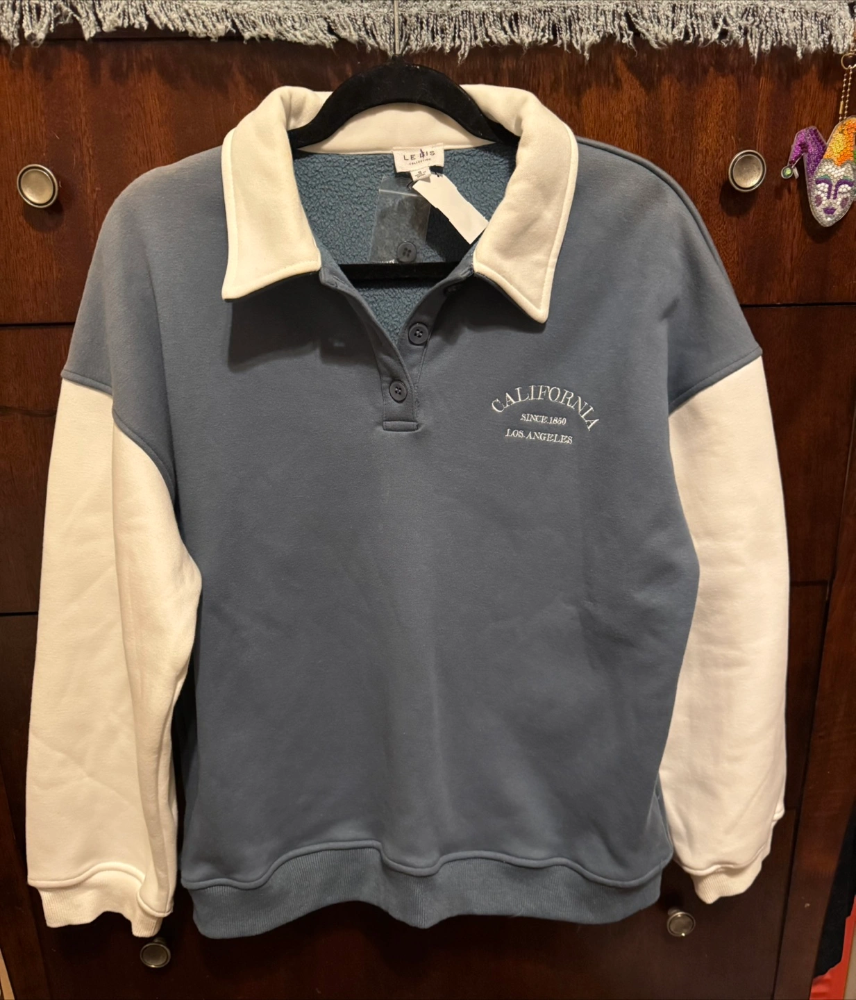Blue and white color block design. Features a collared neckline and button placket. Embroidered 'California Since 1850 Los Angeles' text on the chest. Long sleeves. Relaxed fit.