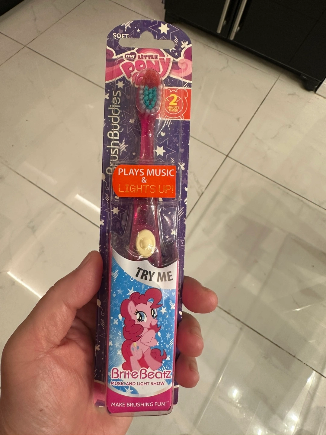 Pink toothbrush. Plays music and lights up. Features My Little Pony Pinkie Pie. 2-minute timer. Soft bristles.