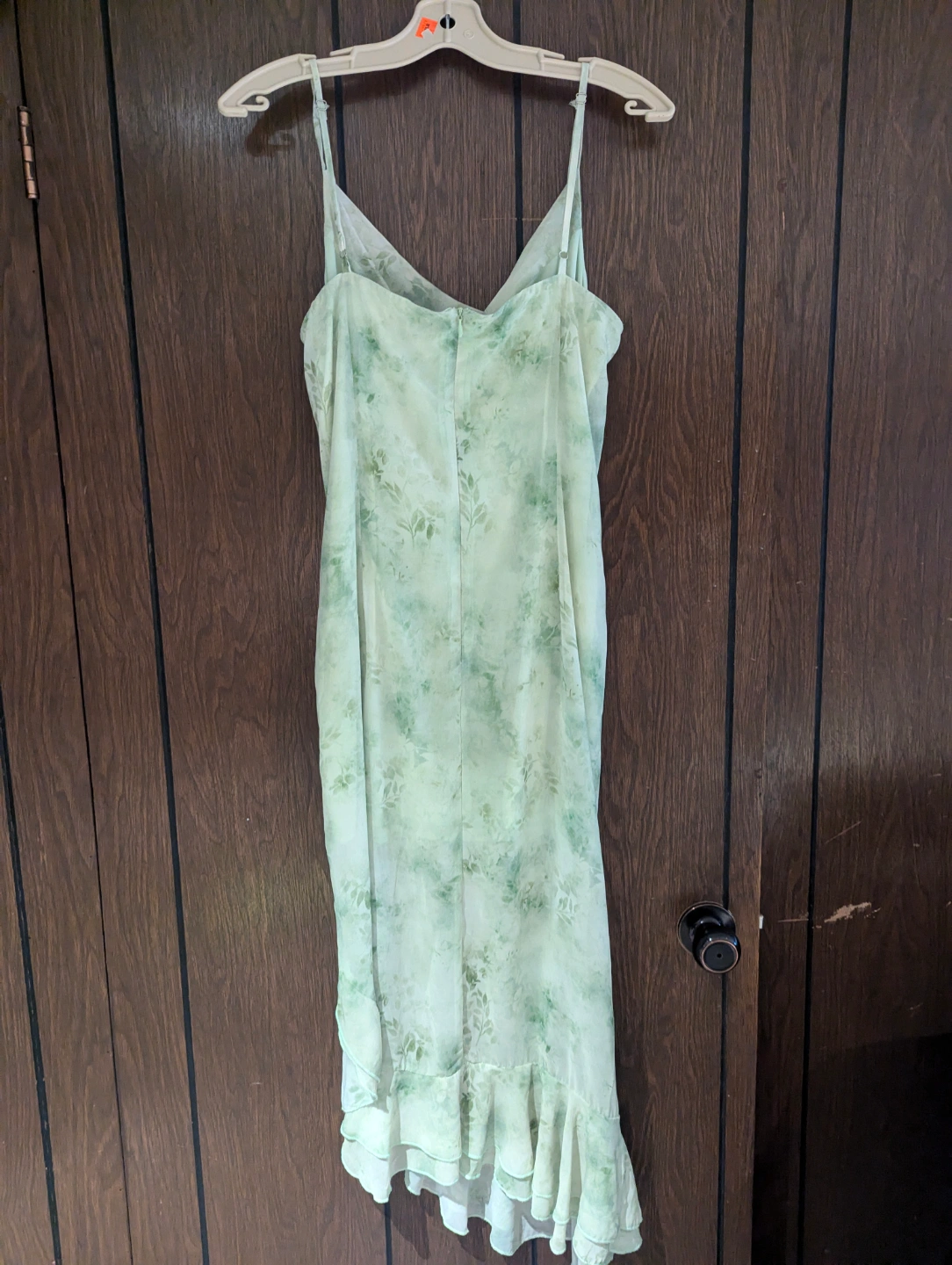 Flowy midi slip dress. Pale green with a floral print. Spaghetti straps. Ruffled hem. Size 12.