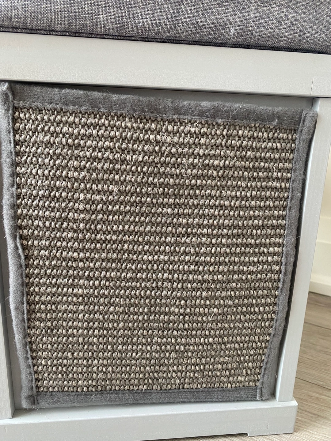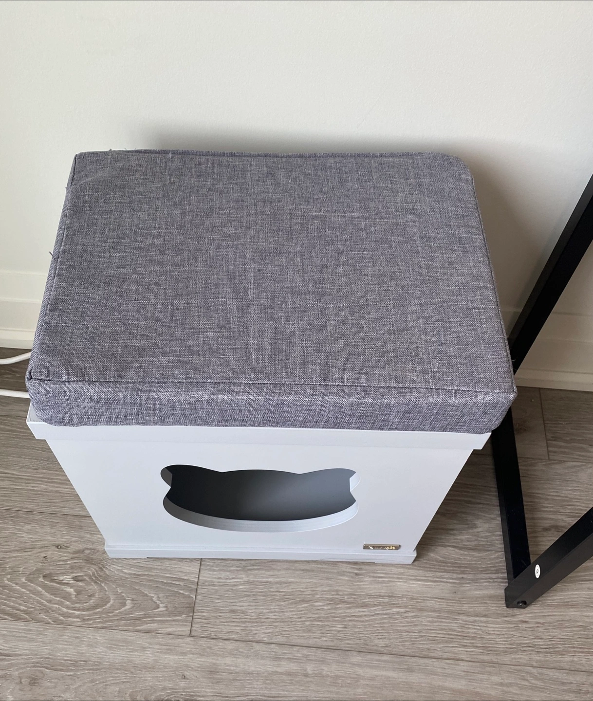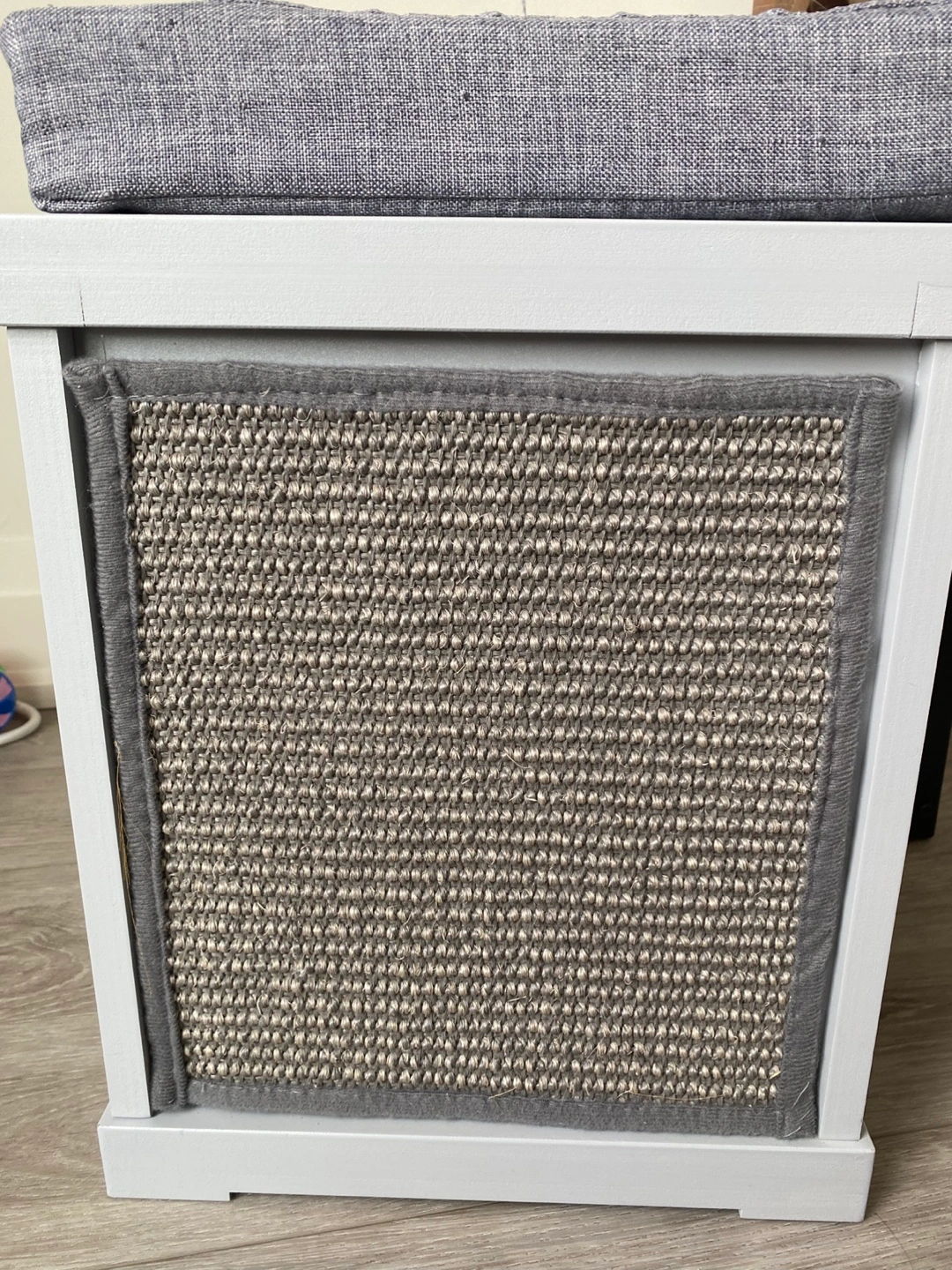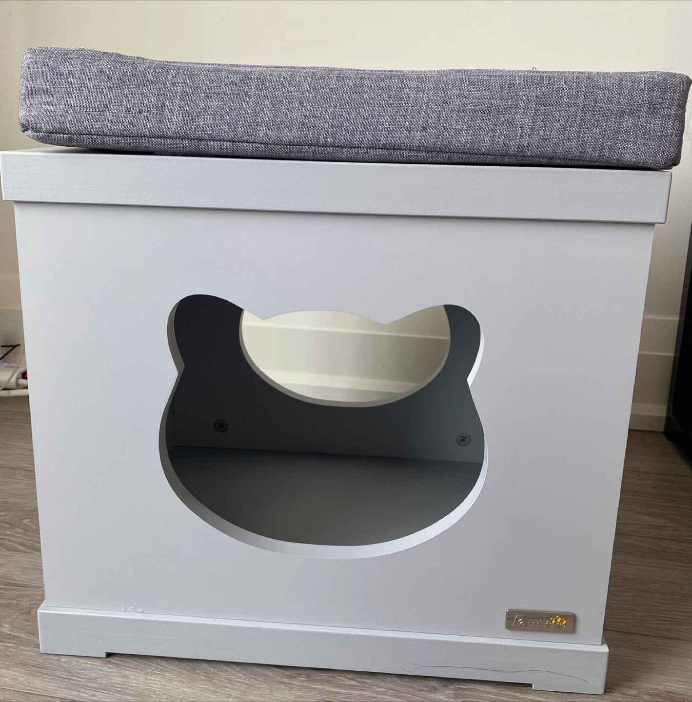 Adorable cat house featuring a grey cushion, integrated scratching post, and cute cat-shaped opening. Light grey colour. Solid wood construction. Easy to clean.