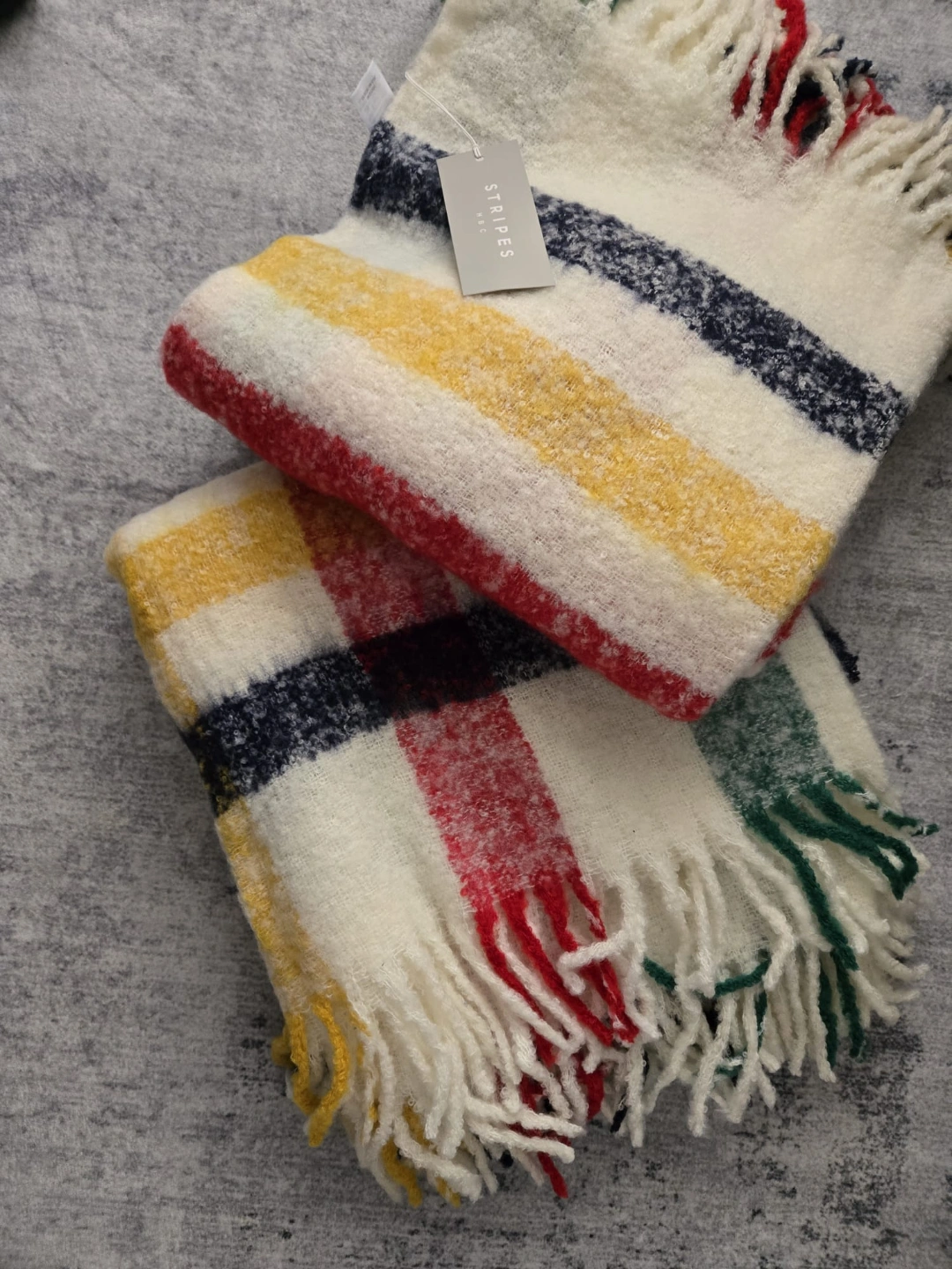 Cozy throw blanket. Features colourful hbc stripes and a fringed edge. Perfect for adding warmth and style to your home. 2 for $300 or 1 for $170(CASH PICKUP ONLY)