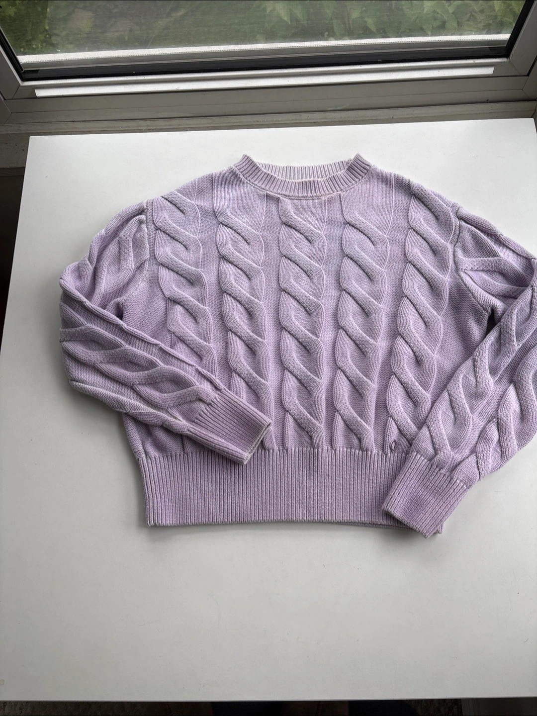 Adorable cropped lavender sweater. Features a cable knit pattern and ribbed cuffs and hem. Size small.