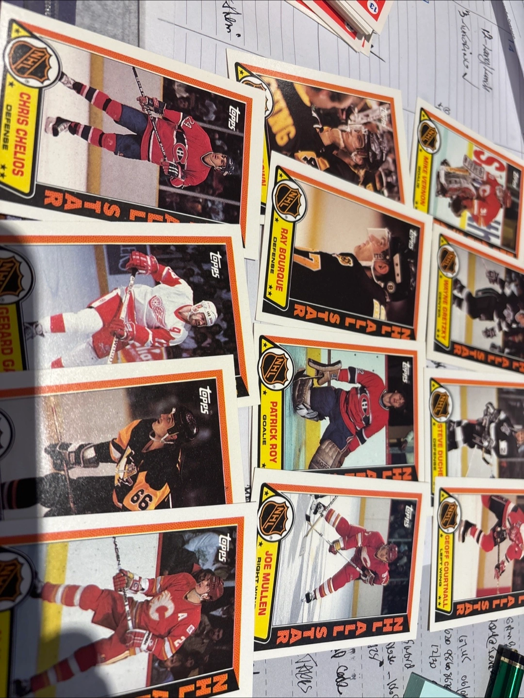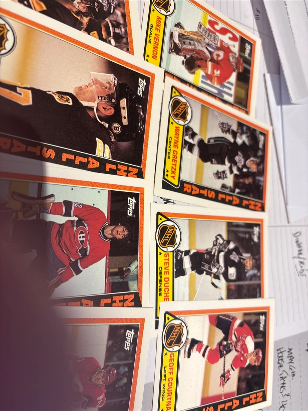 71Collection of vintage Topps NHL hockey trading cards. Features various players. Includes a set of team logo and number stickers.