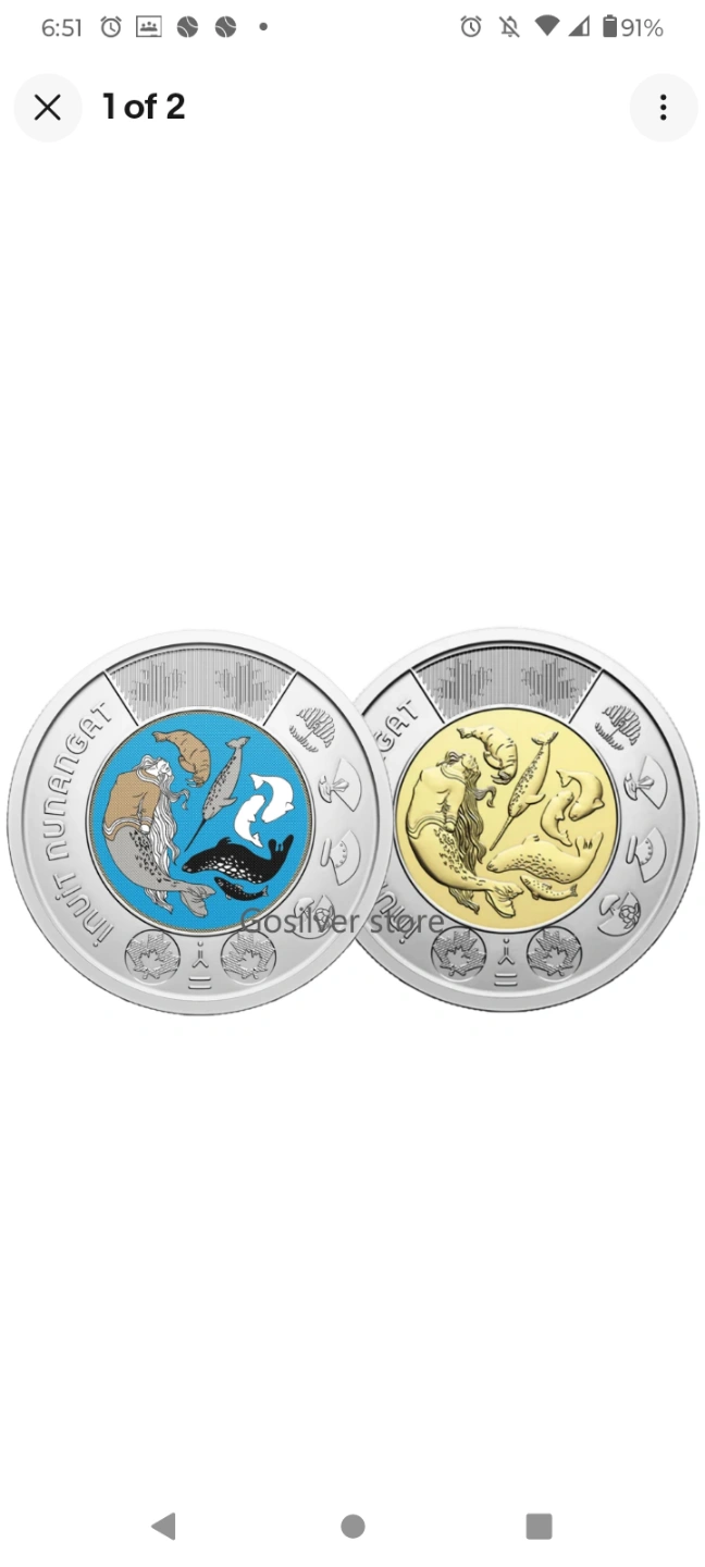 Two $2 commemorative coins. Features artwork of the Nunavut territory. One coin has a blue design, the other gold. Excellent condition.
