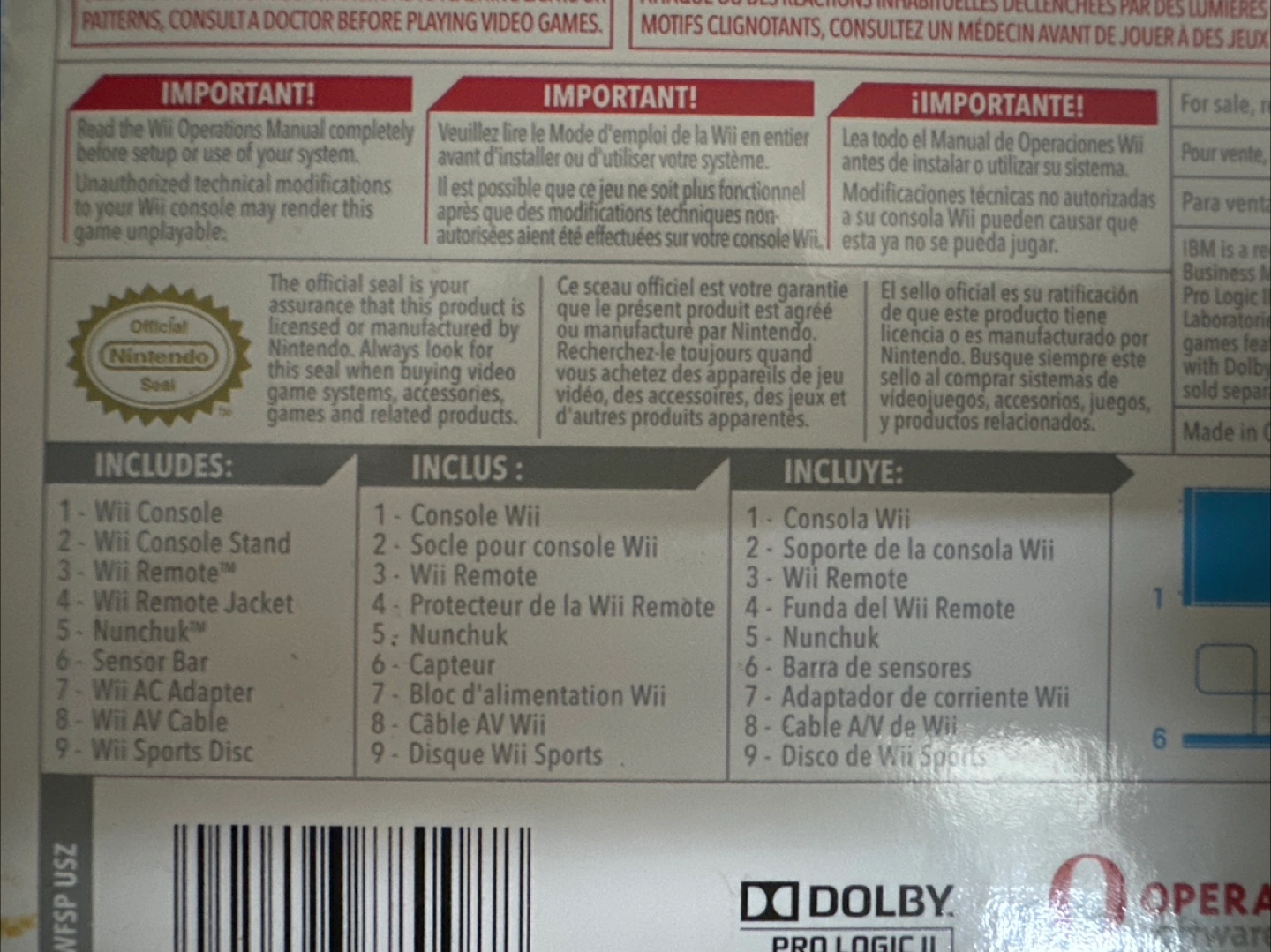 White Nintendo Wii console. Includes Wii Remote, Nunchuk, sensor bar, and all necessary cables. Wii Sports game included. Pre-owned, in box.