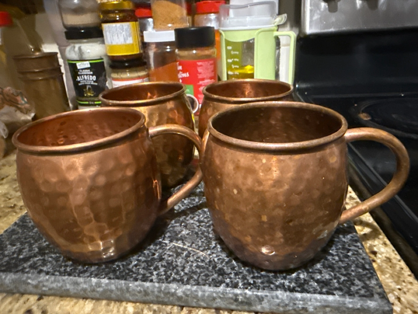 7753 hammered copper mugs. Includes one purple bowl. Pick up: 2600 Donmills Road Thanks