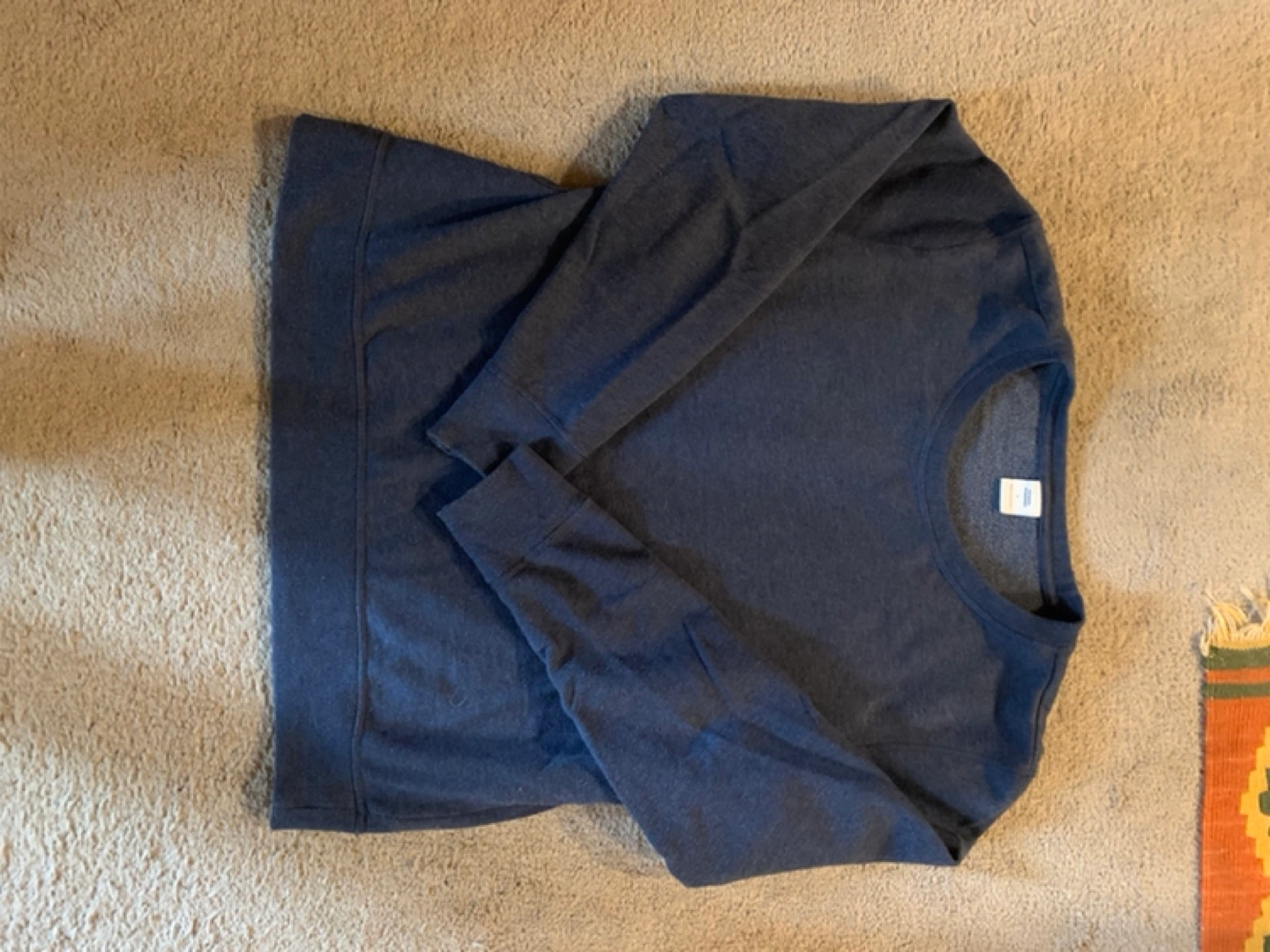 Men's Amazon Essentials size large dark navy blue sweatshirt and joggers. Soft, comfortable, and perfect for lounging or working out. Good used condition. Sweatshirt has long sleeves and a crew neck. Joggers feature an elastic waistband with drawstring. Made in Pakistan.