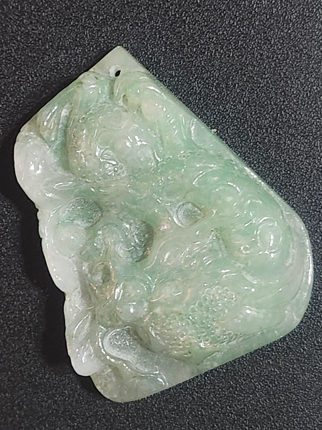 Intricately carved jade pendant. Features a dragon design. Pale green colour. Small hole at the top for hanging.