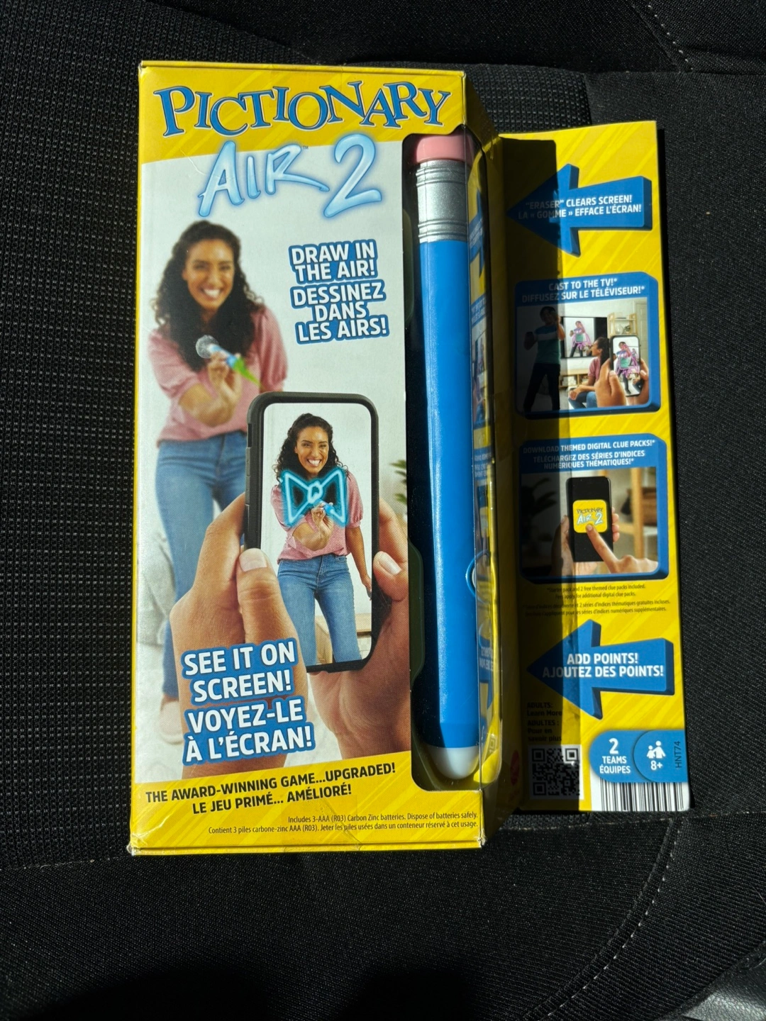 Award-winning game. Draw in the air, see it on screen. Includes drawing device and batteries. For 2 teams, ages 8+. Downloadable clue packs.