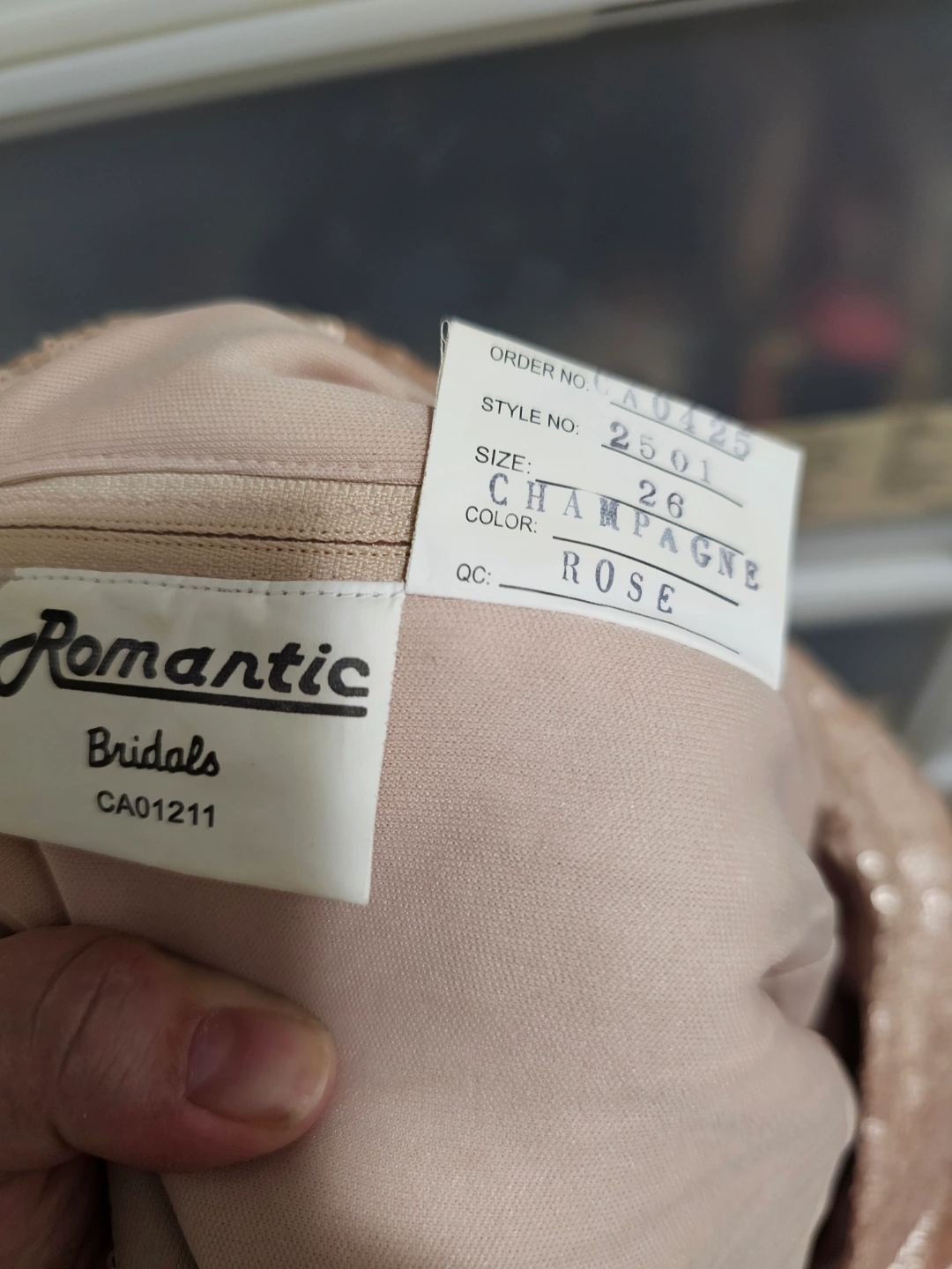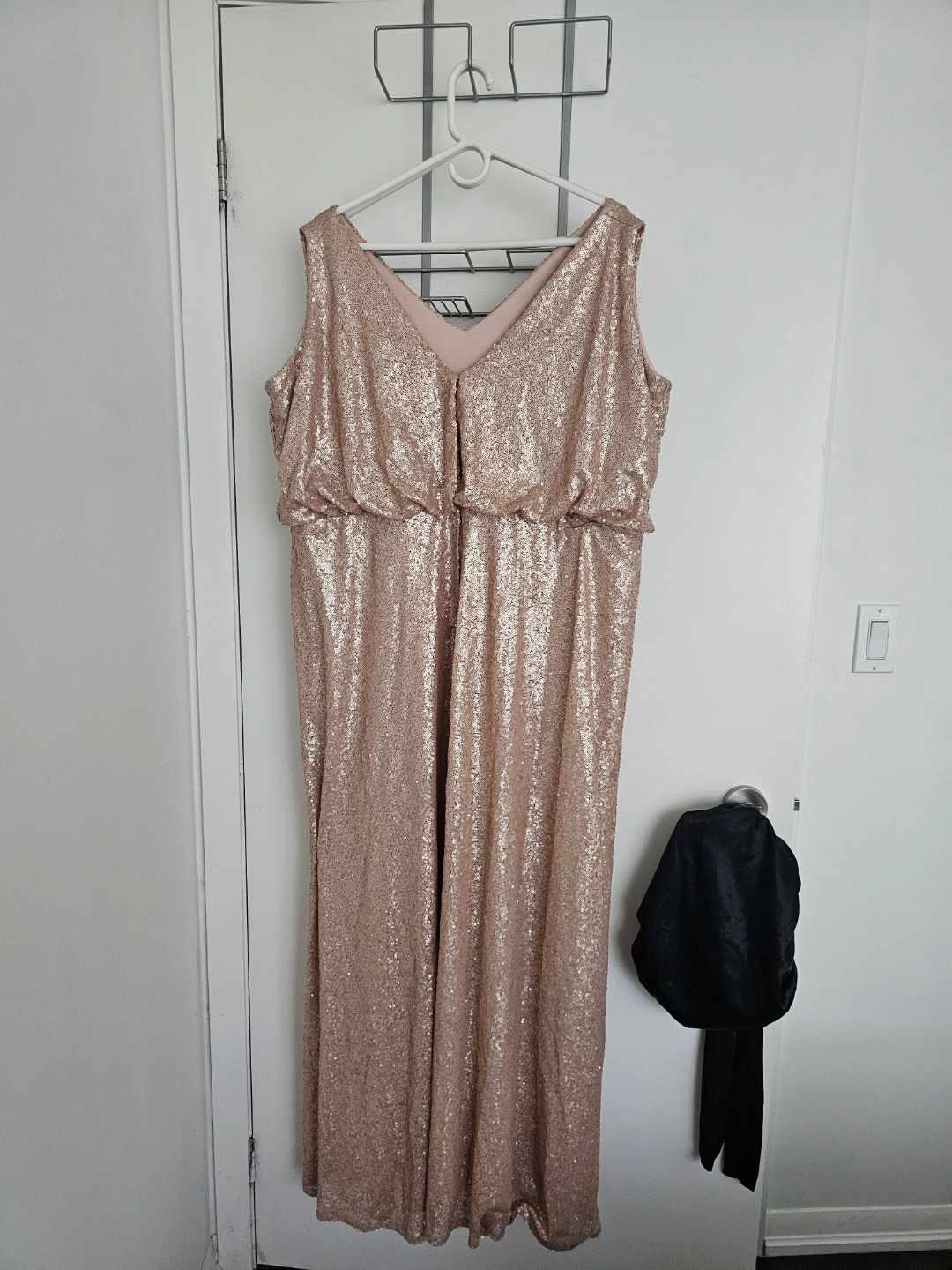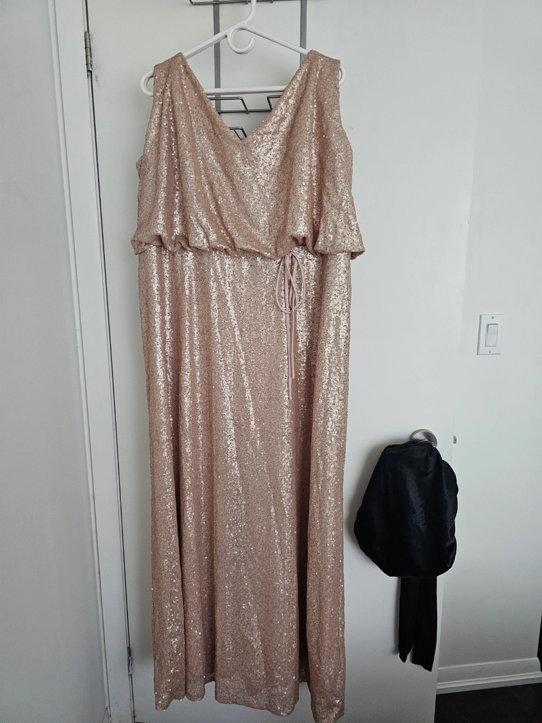Gold sequin maxi dress. Wore once for a couple hours Boning and some lining has been removed. Alteration on top straps. Still in great condition to wear as is or dismantle for another piece.