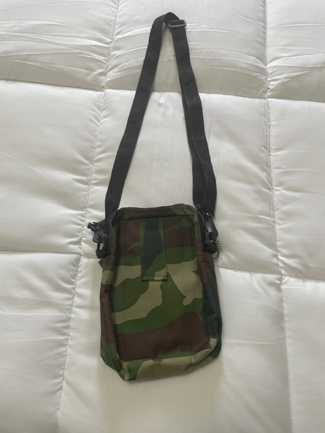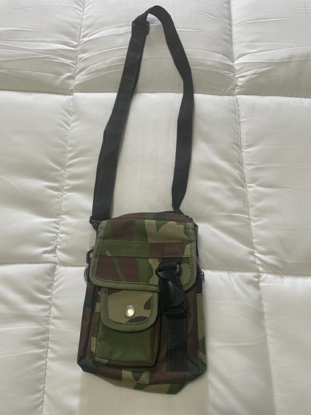 Small crossbody bag. Features a camouflage pattern, adjustable shoulder strap, zipper closure, and a small front pocket. Perfect for everyday use. Can be used by male or female.