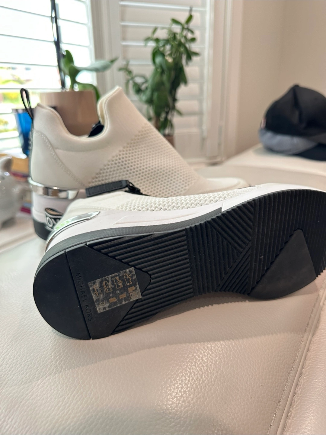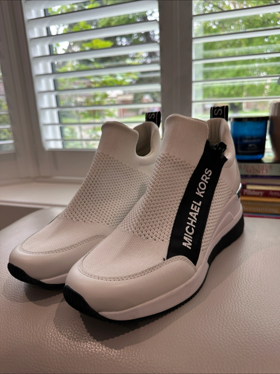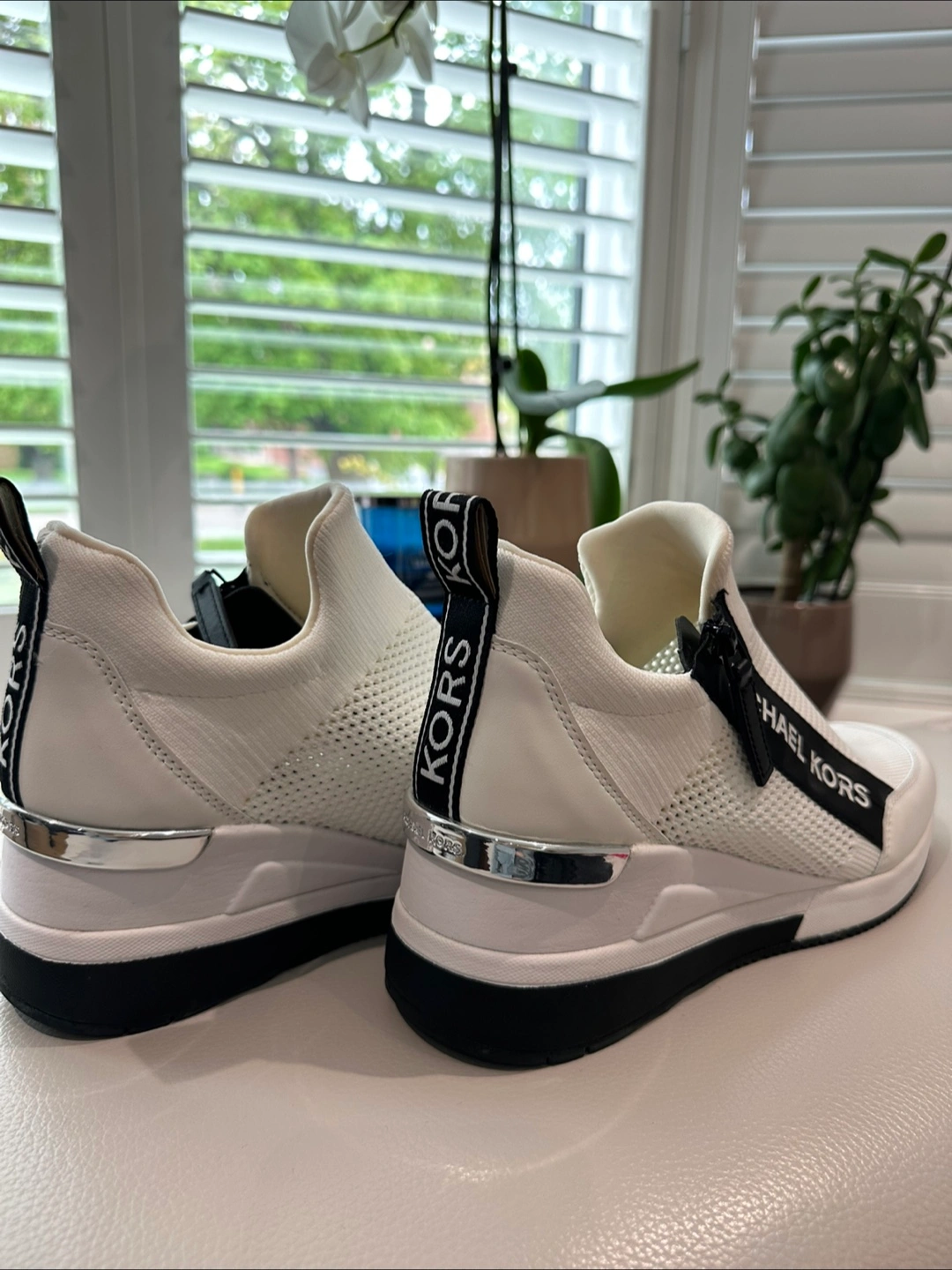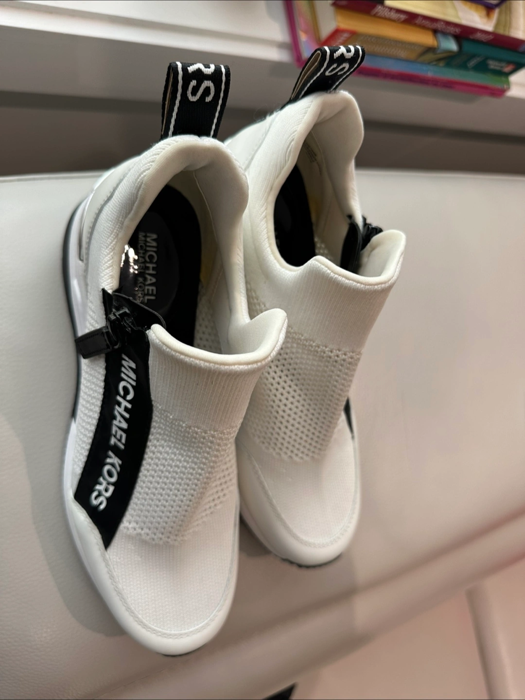 Women's slip-on sneakers. White knit upper, black accents, silver detailing. Comfortable and stylish.