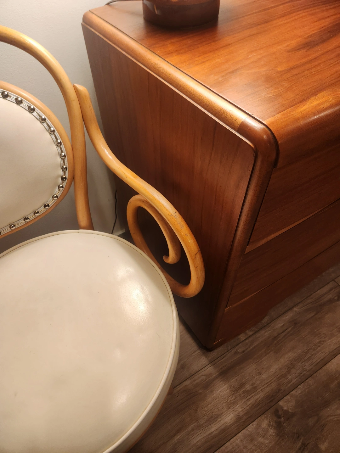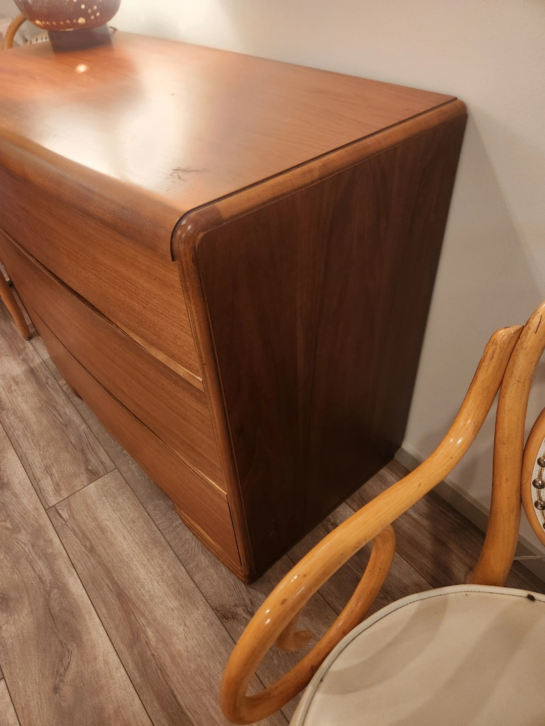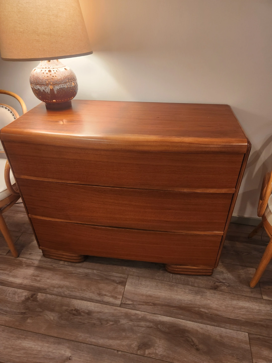 Three- large drawer dresser. Curved top and base. Rich teak wood finish .EXCELLENT quality and craftmanship. Simple, classic 1930's find. A perfect addition to any chatacter or retro-inspired home. measures. measures 20 inches deep, 42 inches wide and 33 inches tall