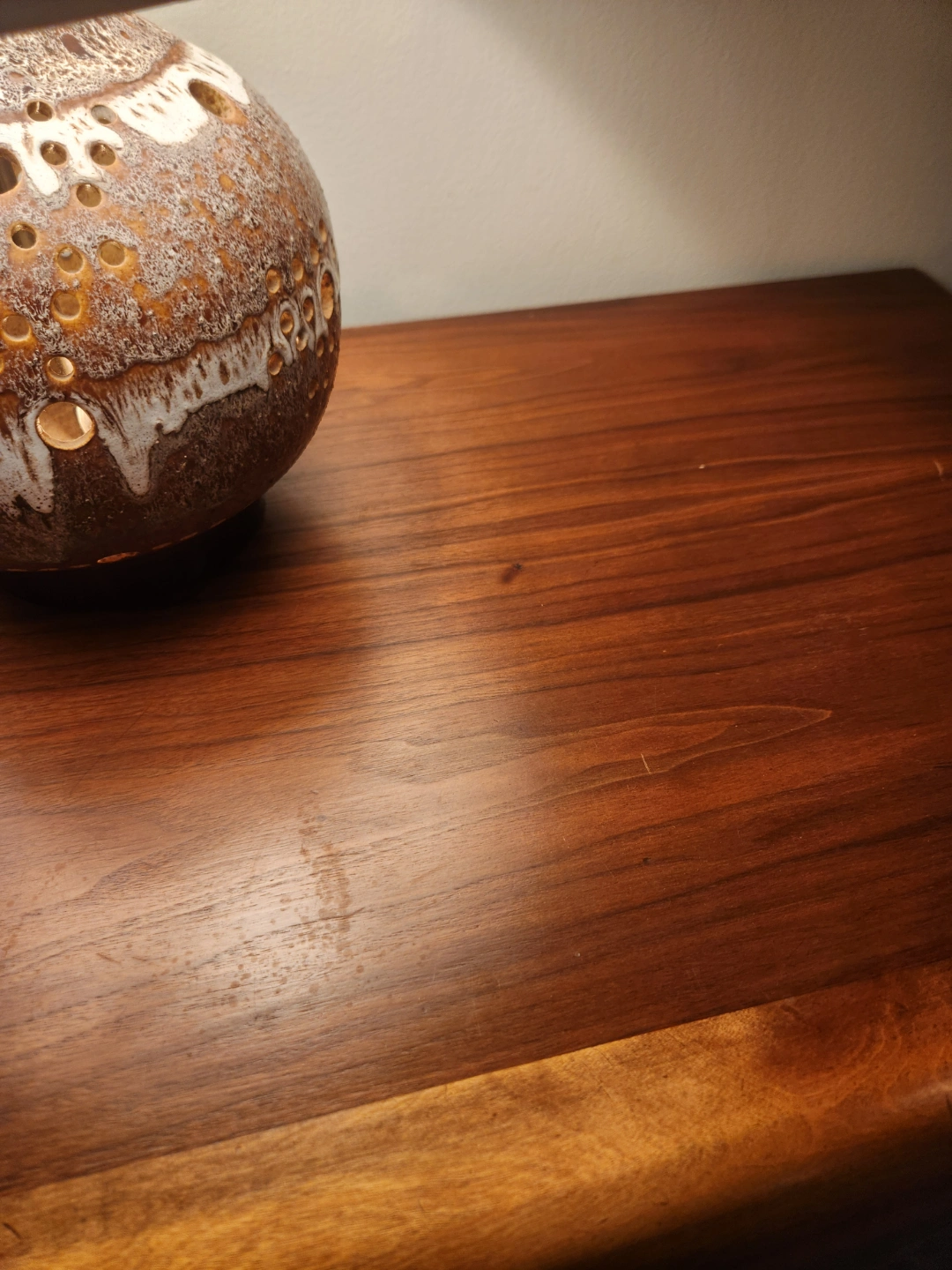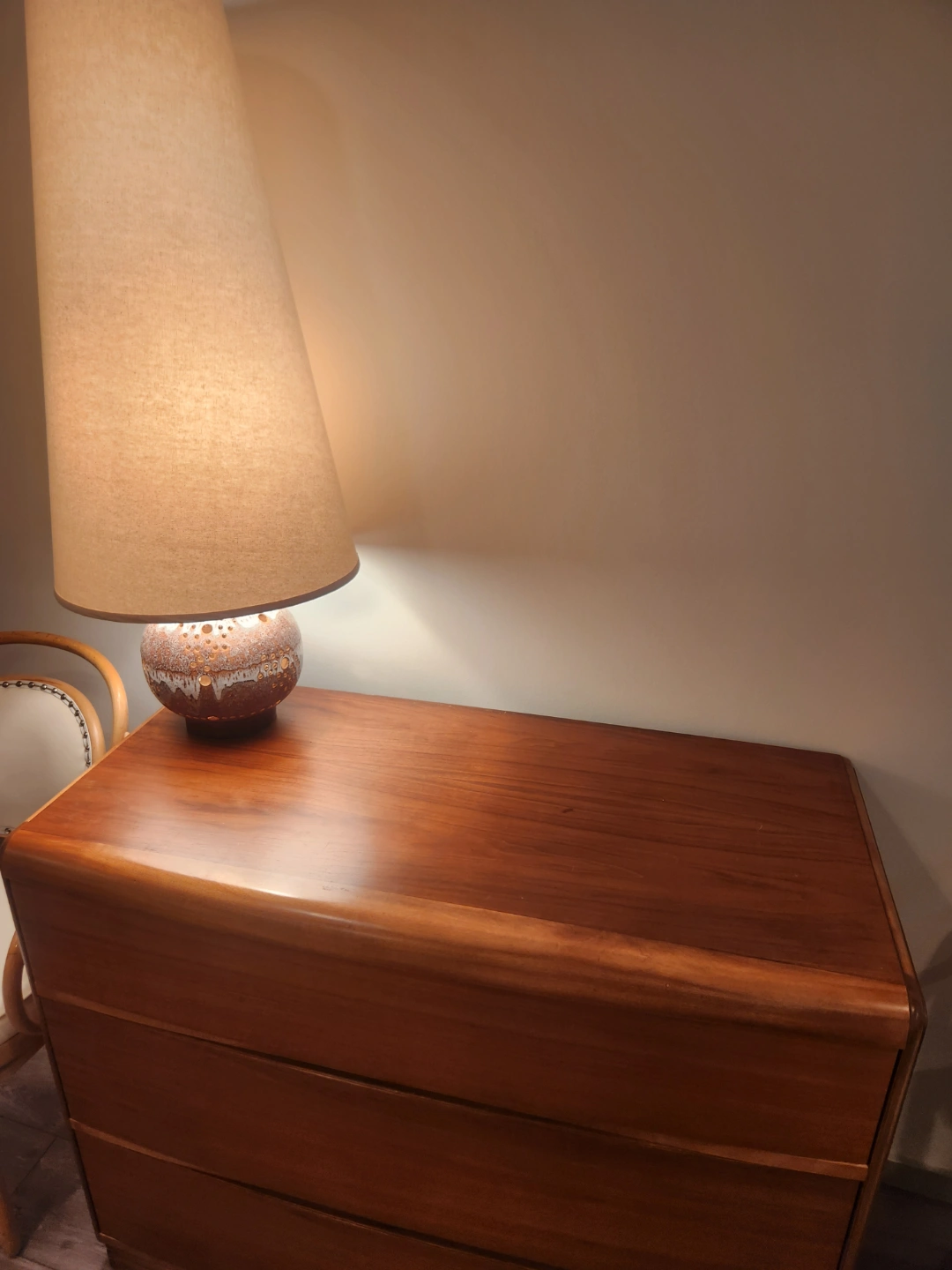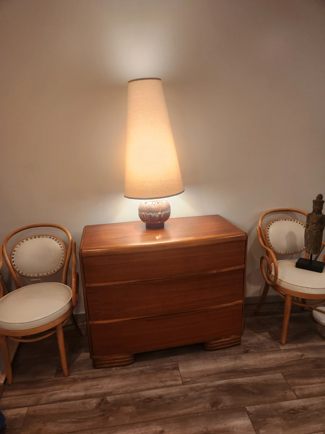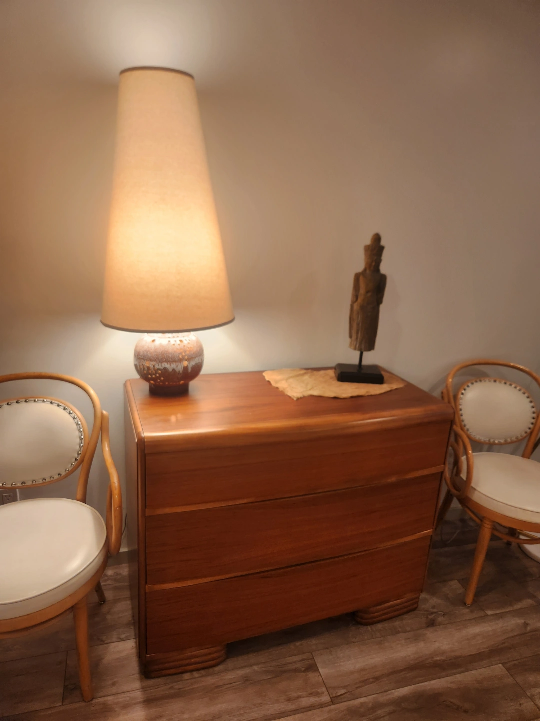 Three- large drawer dresser. Curved top and base. Rich teak wood finish .EXCELLENT quality and craftmanship. Simple, classic 1930's find. A perfect addition to any chatacter or retro-inspired home. measures. measures 20 inches deep, 42 inches wide and 33 inches tall