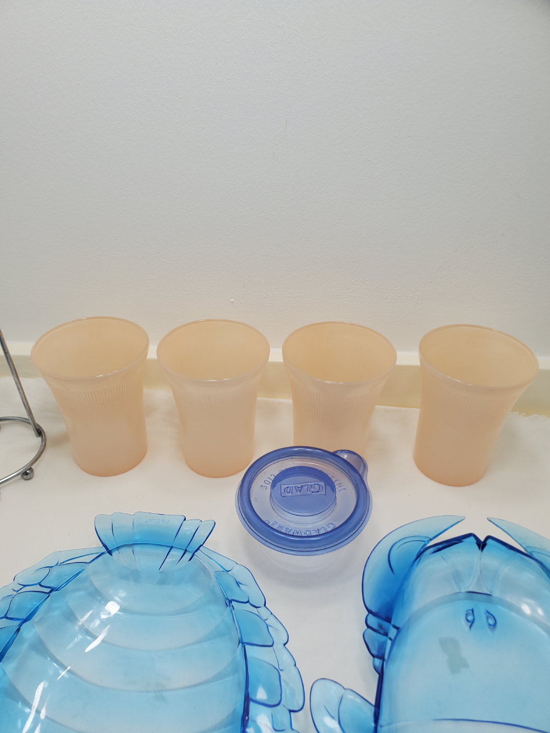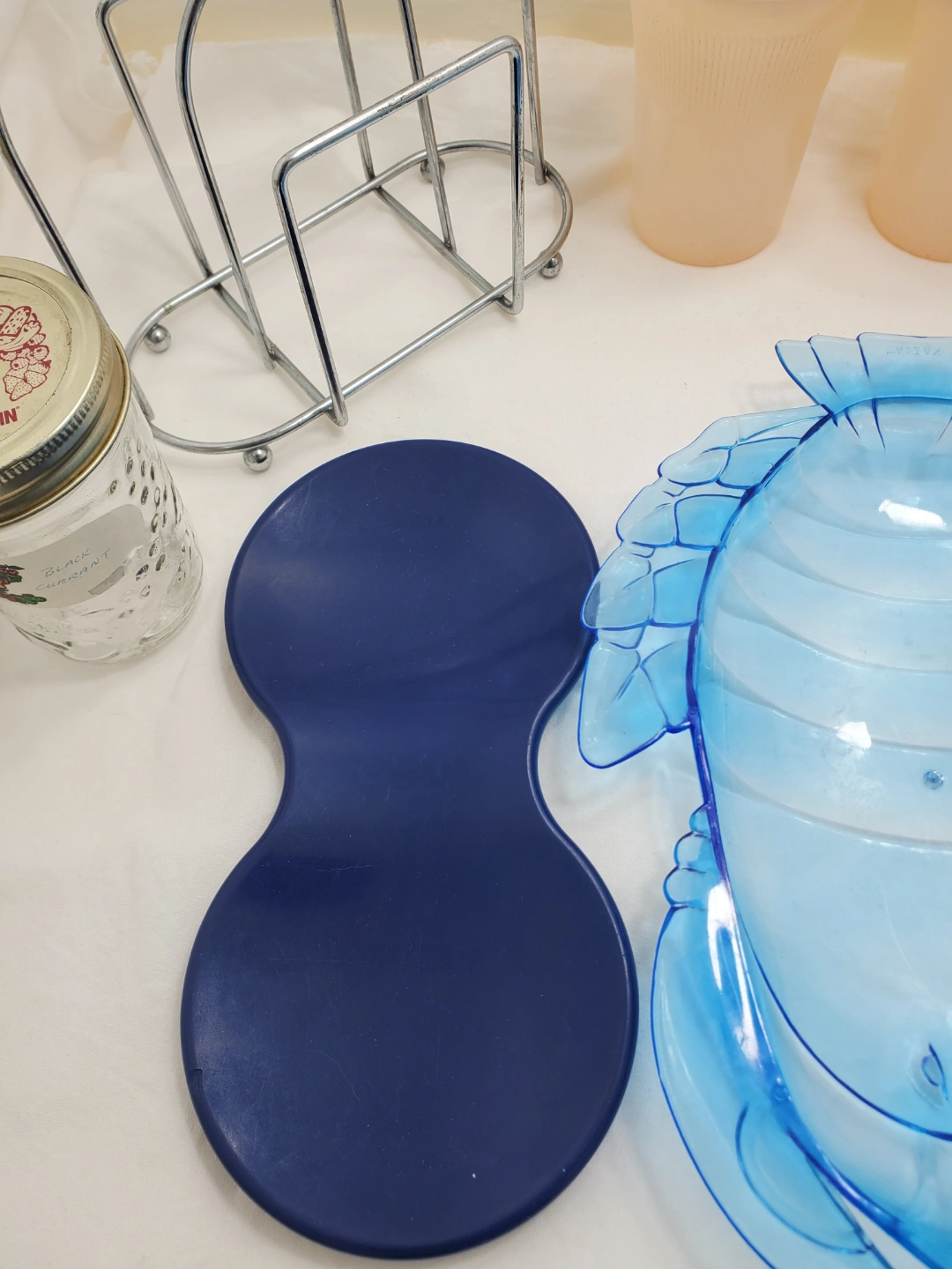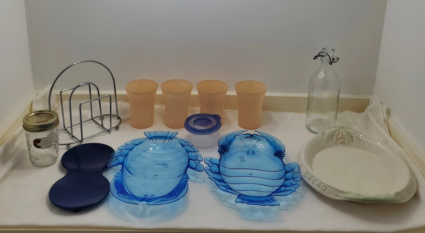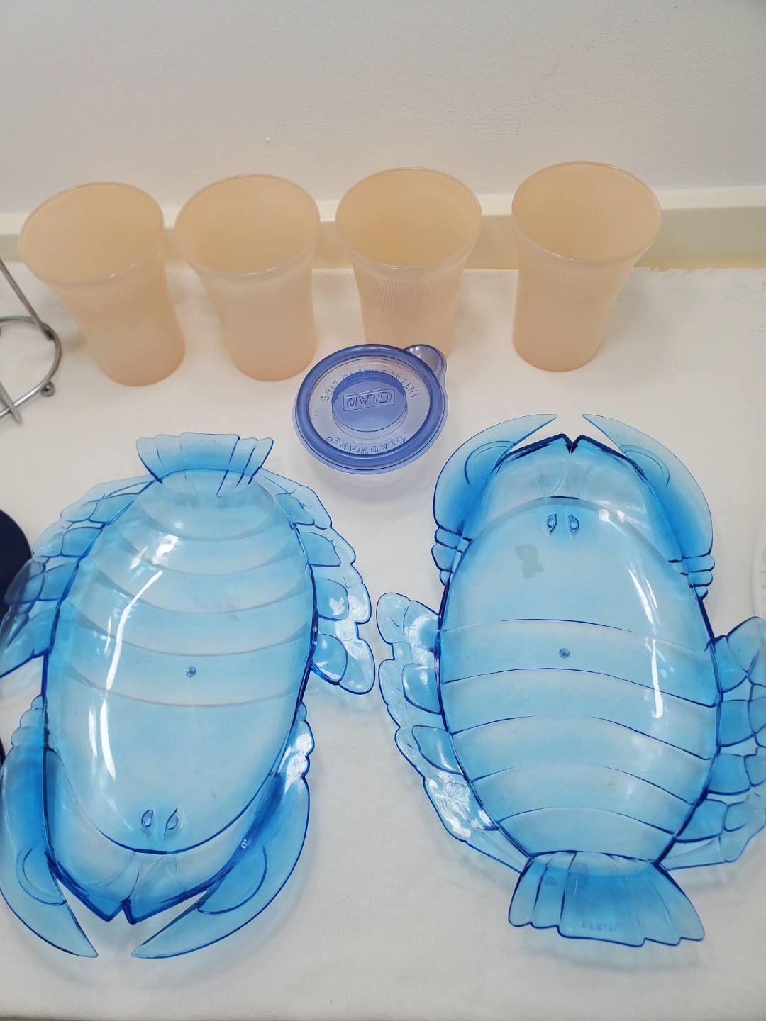 Assortment of kitchen and dining items. Includes four pale pink glasses, two blue lobster-shaped dishes, a plate, a glass swing-top bottle, a metal napkin holder, a dark blue spoon rest and a small glass jar with a Bernardin lid. Items have some wear.