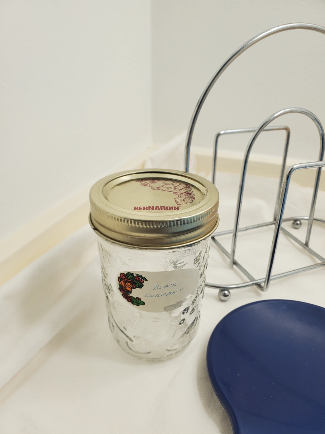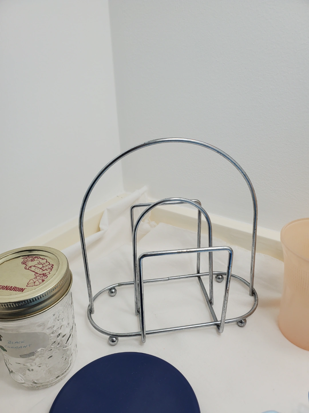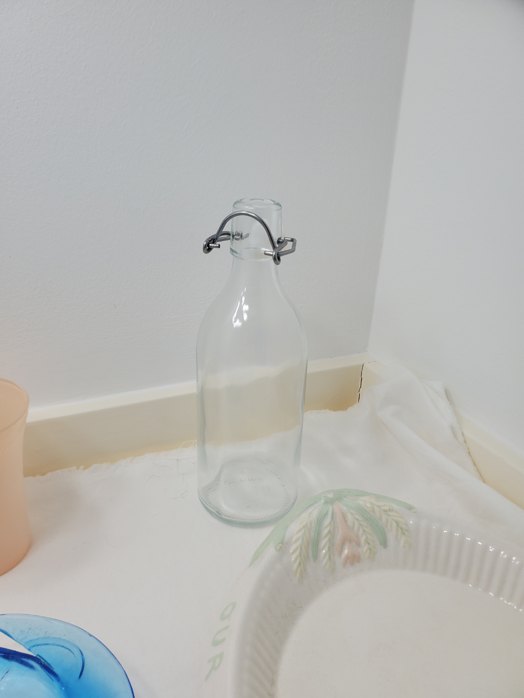 Assortment of kitchen and dining items. Includes four pale pink glasses, two blue lobster-shaped dishes, a plate, a glass swing-top bottle, a metal napkin holder, a dark blue spoon rest and a small glass jar with a Bernardin lid. Items have some wear.