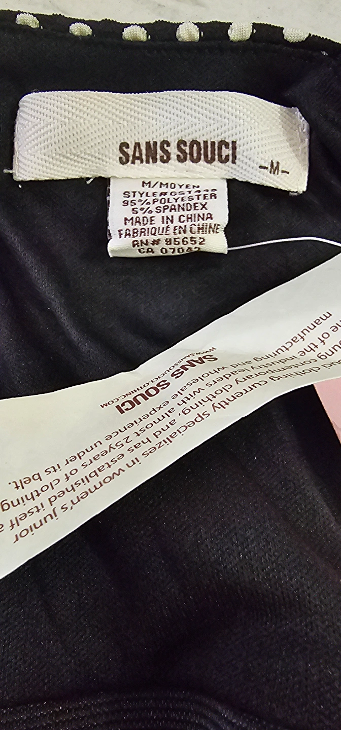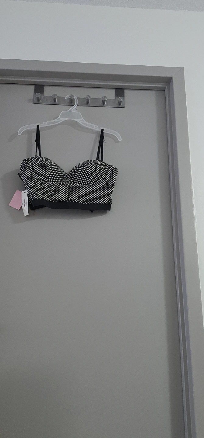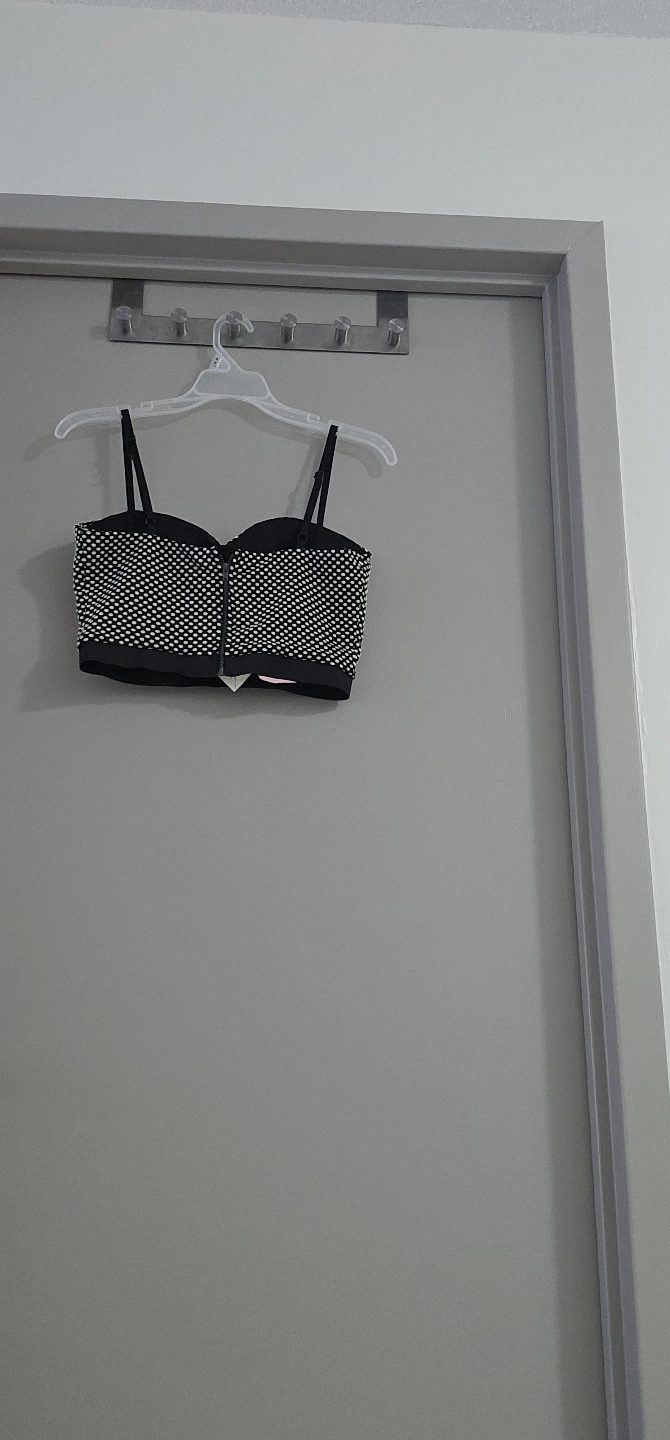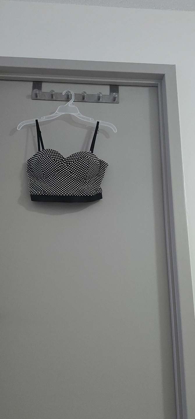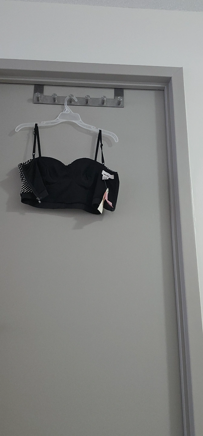 1000+Black crop top with white polka dots. Strapless with thin straps. Back zipper closure. Size Medium.