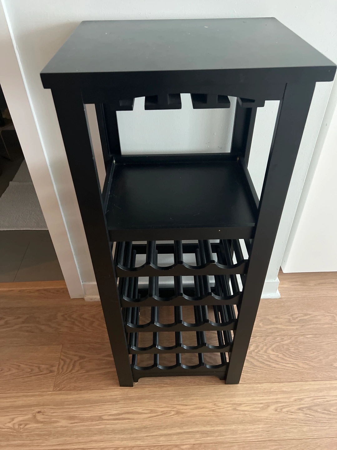 Freestanding solid wood wine rack. Black wood finish. Holds multiple bottles. Small top shelf. Good condition.