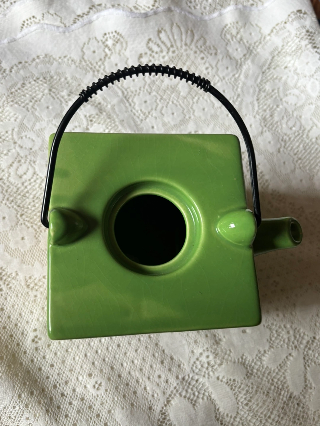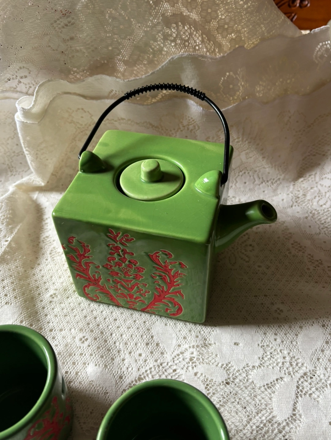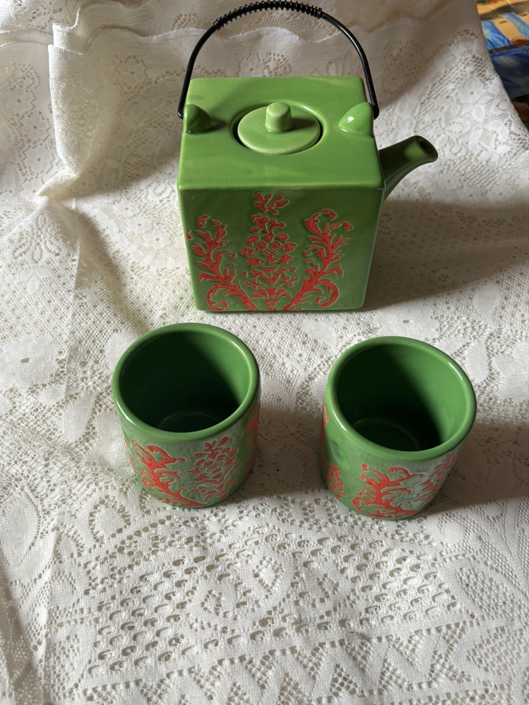 Square teapot with two matching cups. Features a floral design. Metal handle.