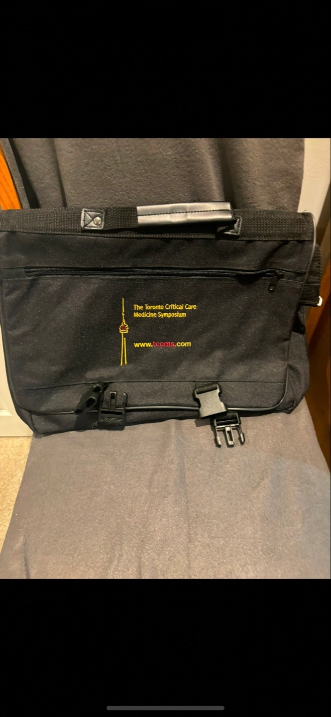 376New never used Black messenger bag. Features multiple pockets and compartments. Embroidered with the Toronto Critical Care Medicine Symposium logo. Adjustable shoulder strap. Durable material. Great for everyday use or travel. Smoke free pet free home Pick up can be Rathburn and the west mall area Or Symington and DuPont