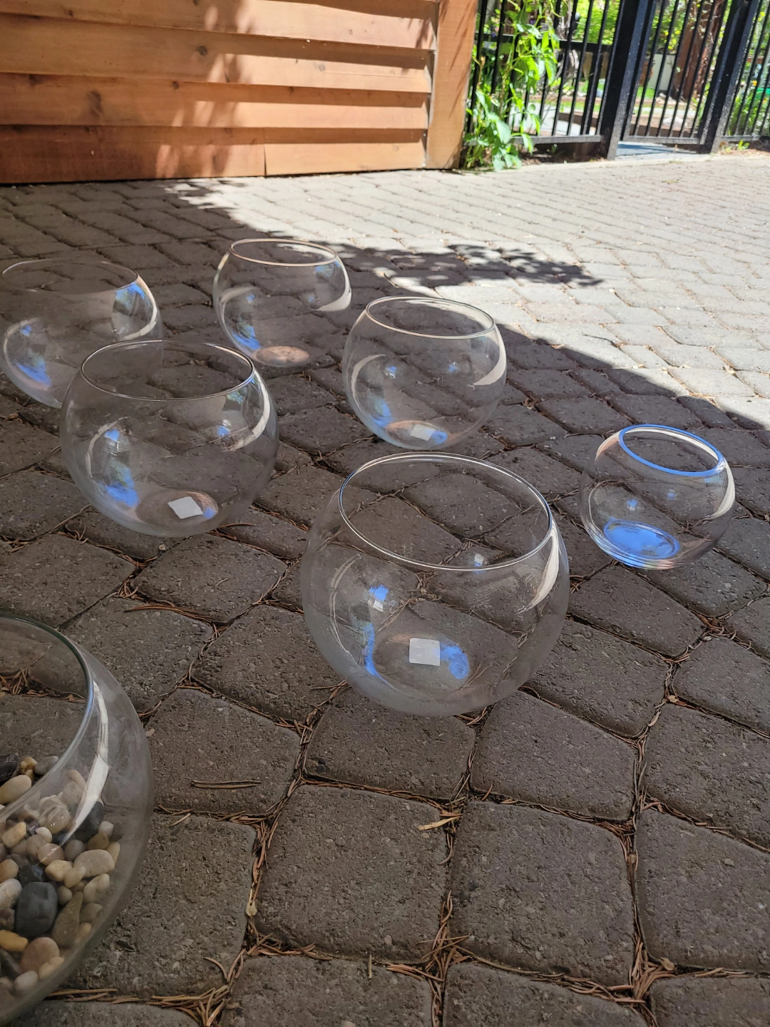 Collection of 13 clear glass fishbowls, varying sizes. Three contain decorative items: seashells and pebbles. Great for terrariums, centrepieces, or home decor.