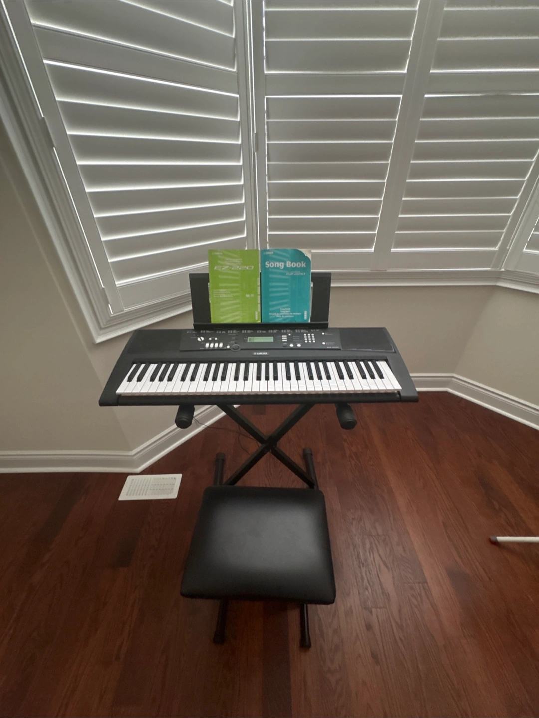 61-key portable keyboard. Includes adjustable bench and songbook. Great for beginners. Power adapter included. Has a light-up keys and a bunch of different games!!