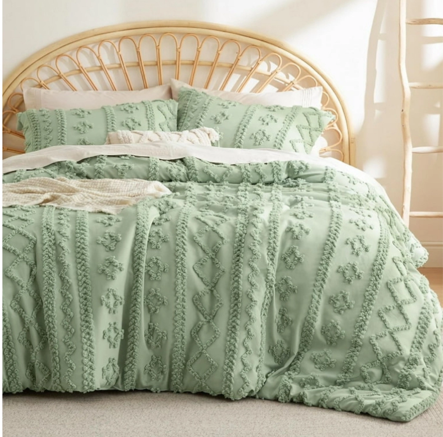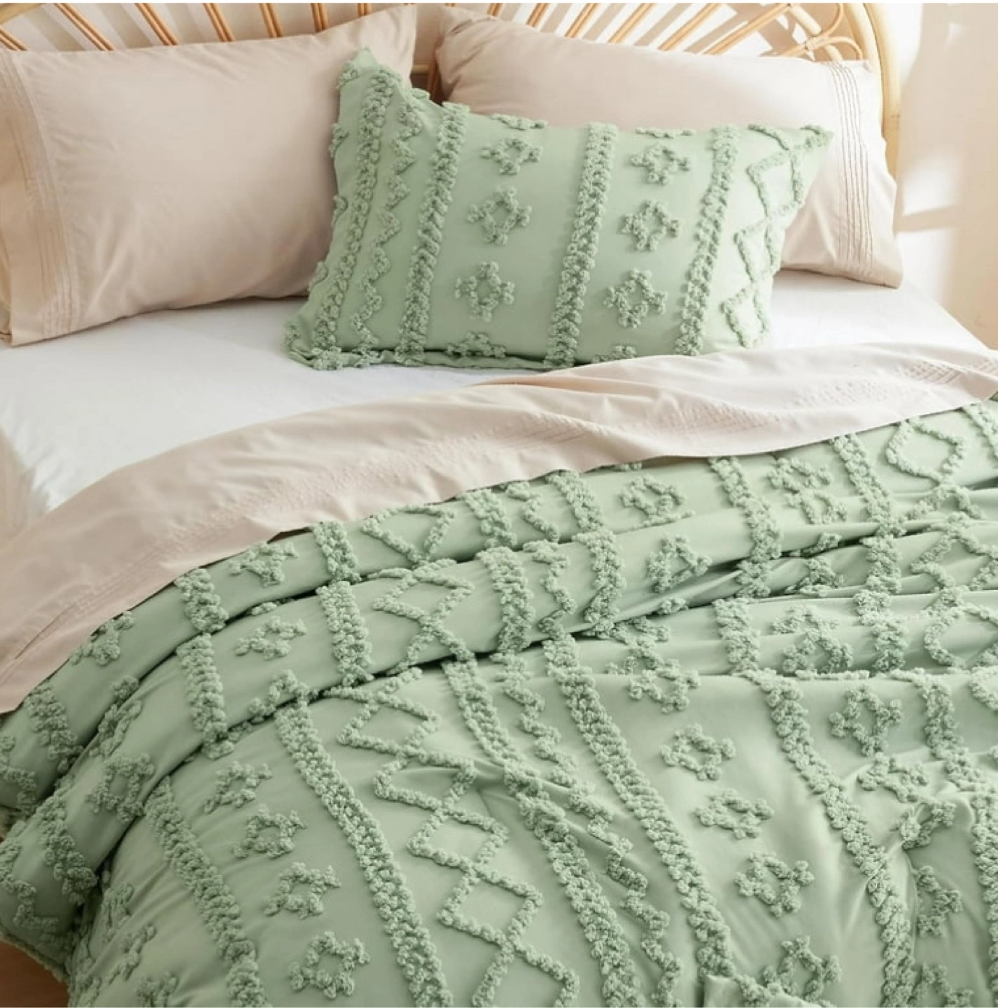 Add a touch of bohemian style to your bedroom with this new Bedsure sage green comforter set, featuring a tufted diamond pattern and soft, cozy fabric. 3-Piece Farmhouse Shabby Chic Embroidery Bed Set. Soft Jacquard Comforter for All Seasons. This set includes one comforter and two pillow shams.