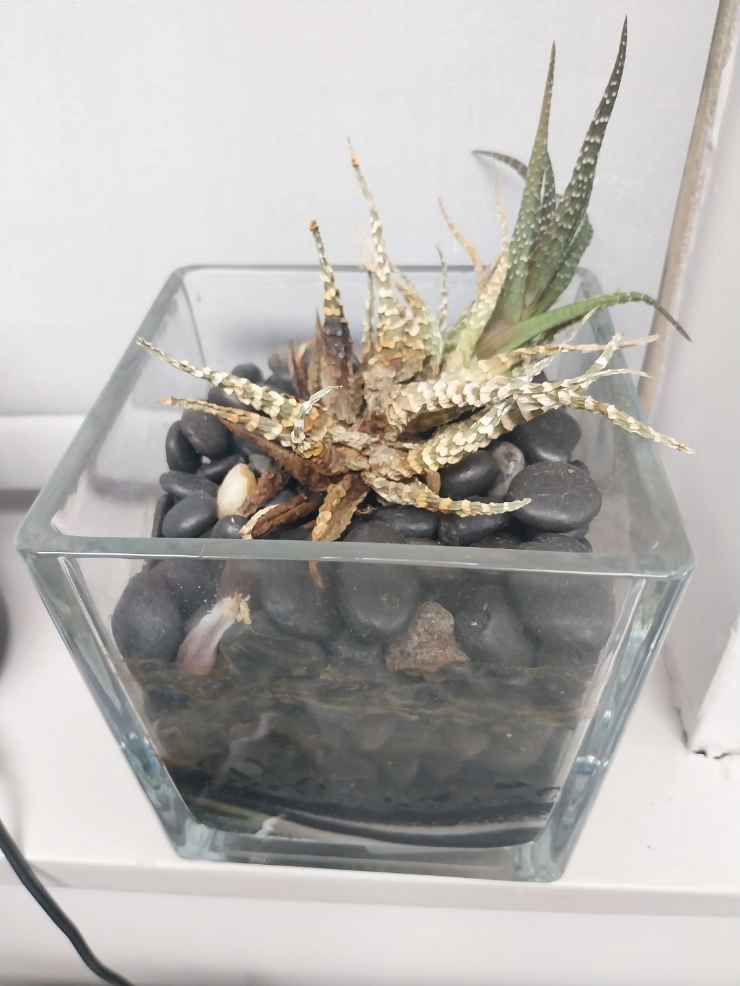 Small Haworthia attenuata succulent planted in a square glass container. Black stones and soil used as medium.