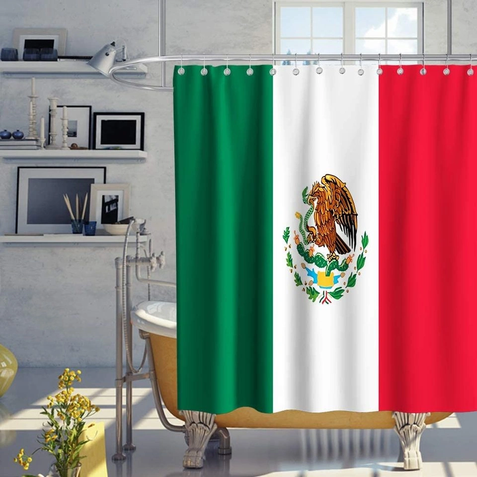 Shower curtain features the Mexican flag. Green, white, and red panels. Coat of arms in center. Machine washable.