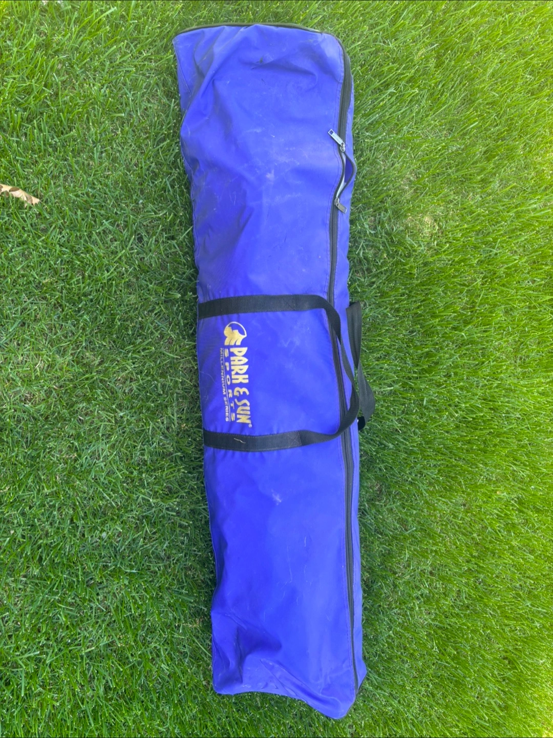 Portable badminton and volleyball set. Includes net, poles, rackets, birdies, and carrying bag. Great for backyard fun.