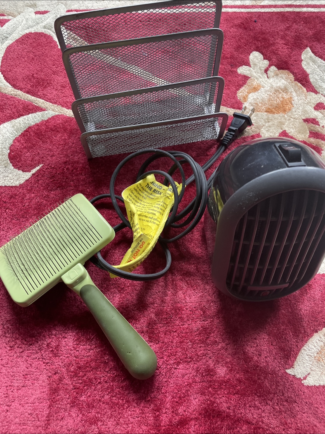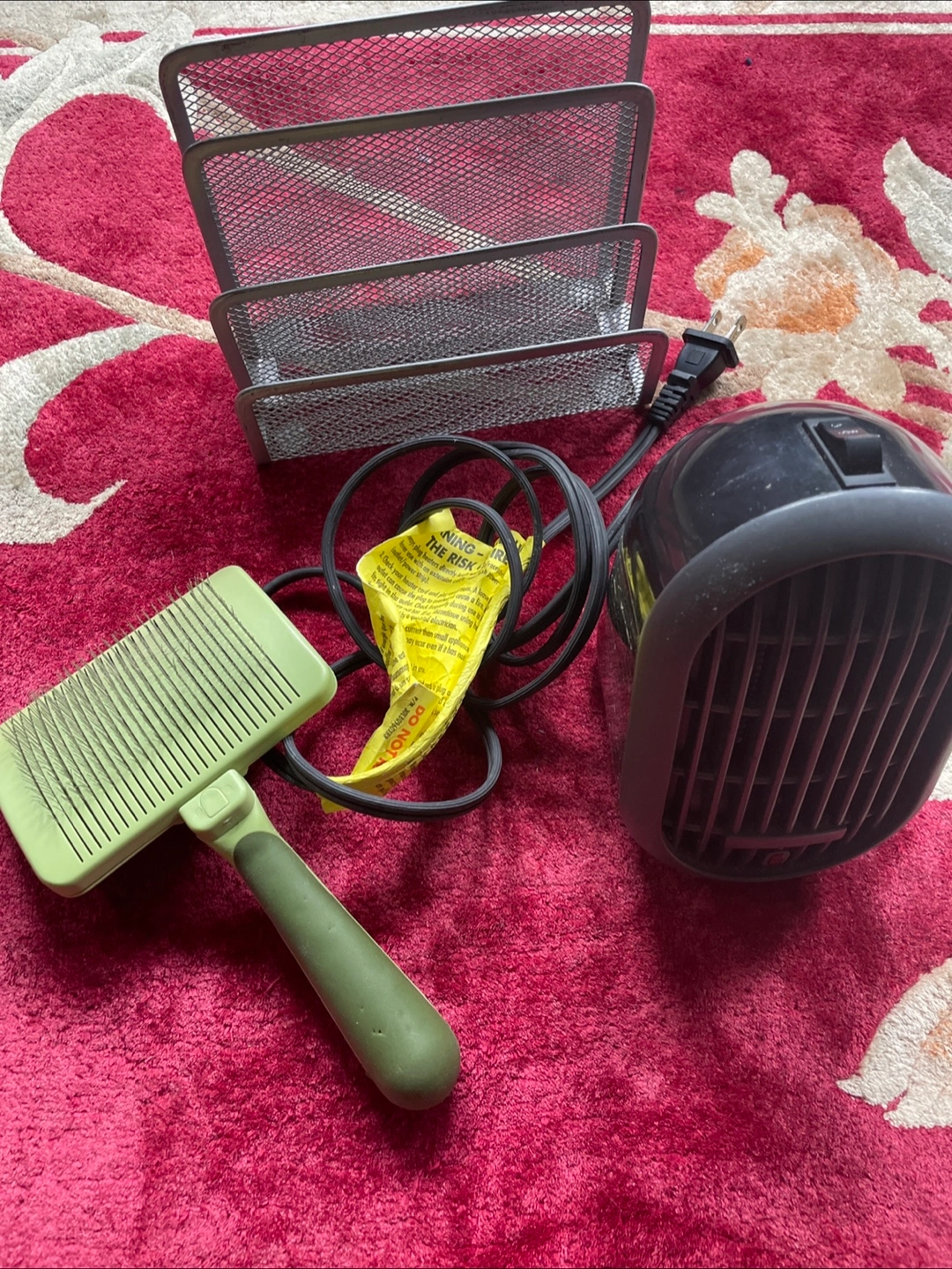 Metal desk organiser, green pet brush, and small personal heater. All used but in good condition. Great for a home office or dorm room.
