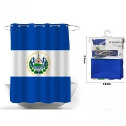 Shower curtain and bath mat set. Features El Salvador's national flag. Polyester material. Machine washable. Great for adding a patriotic touch to your bathroom.