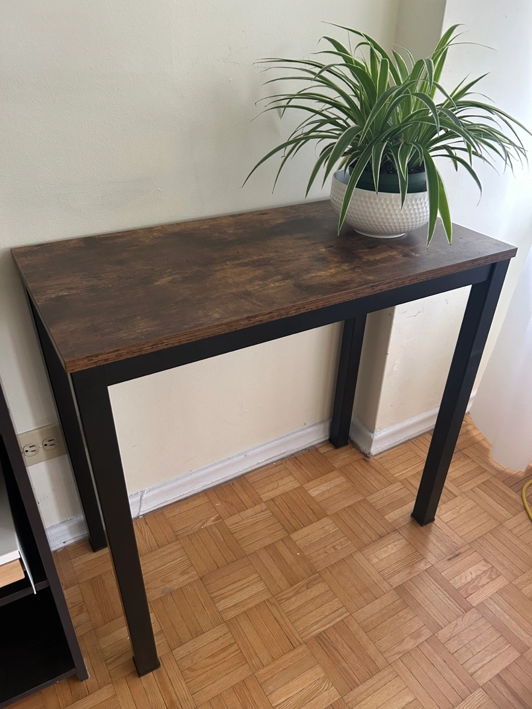 This sleek and minimal console table is perfect for small spaces, entryways, or as a compact work-from-home desk. With a warm wood surface and sturdy black metal legs, it fits easily into modern, minimalist, or industrial decor styles. Dimensions: Length: 31.5” Width: 15.7” Height: 29” - Great for plants, books, or a small laptop setup - Lightweight but sturdy - Neutral design to match any room - From a smoke-free, pet-free home - Pickup only 🚫 Plant not for sale Pickup Location - Brentwood Towers, Davisville