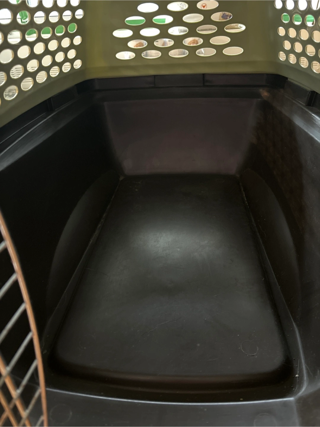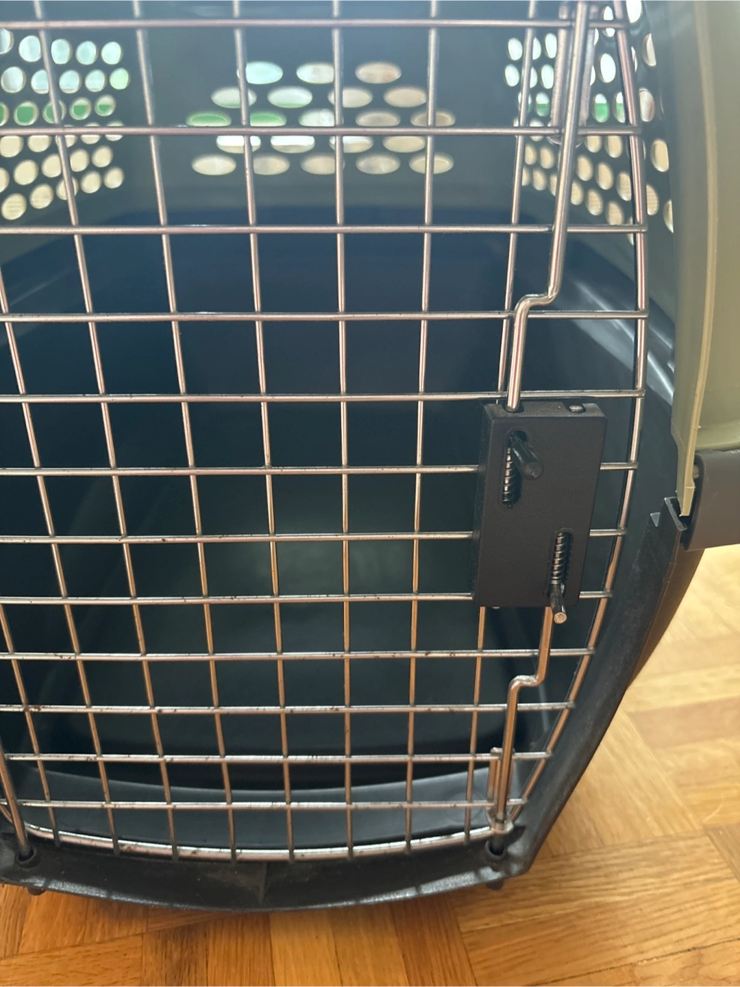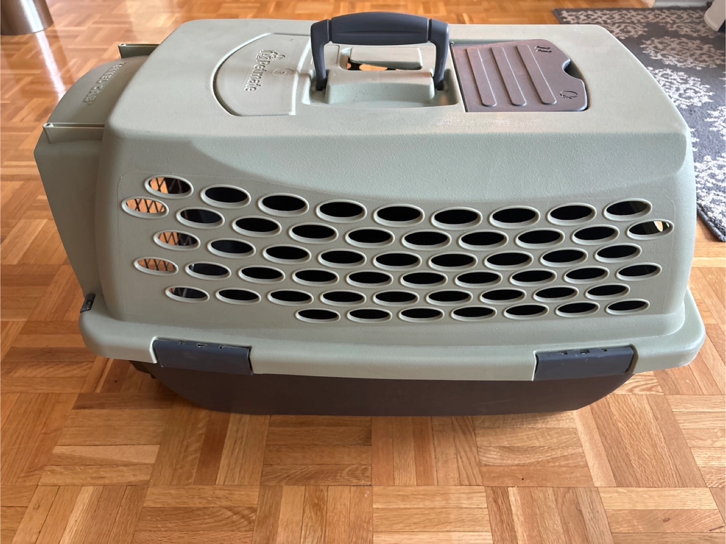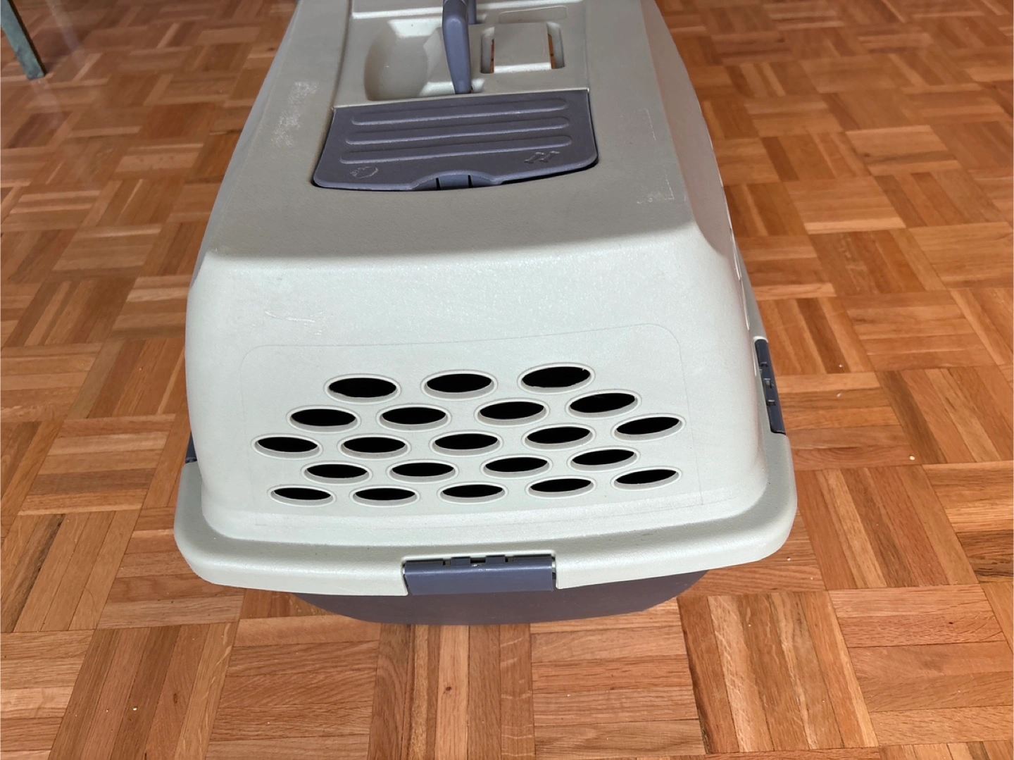 Durable plastic pet carrier. Features a convenient top handle and secure latch. Multiple ventilation holes. Ideal for travel.