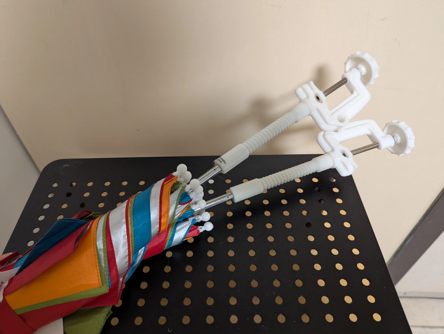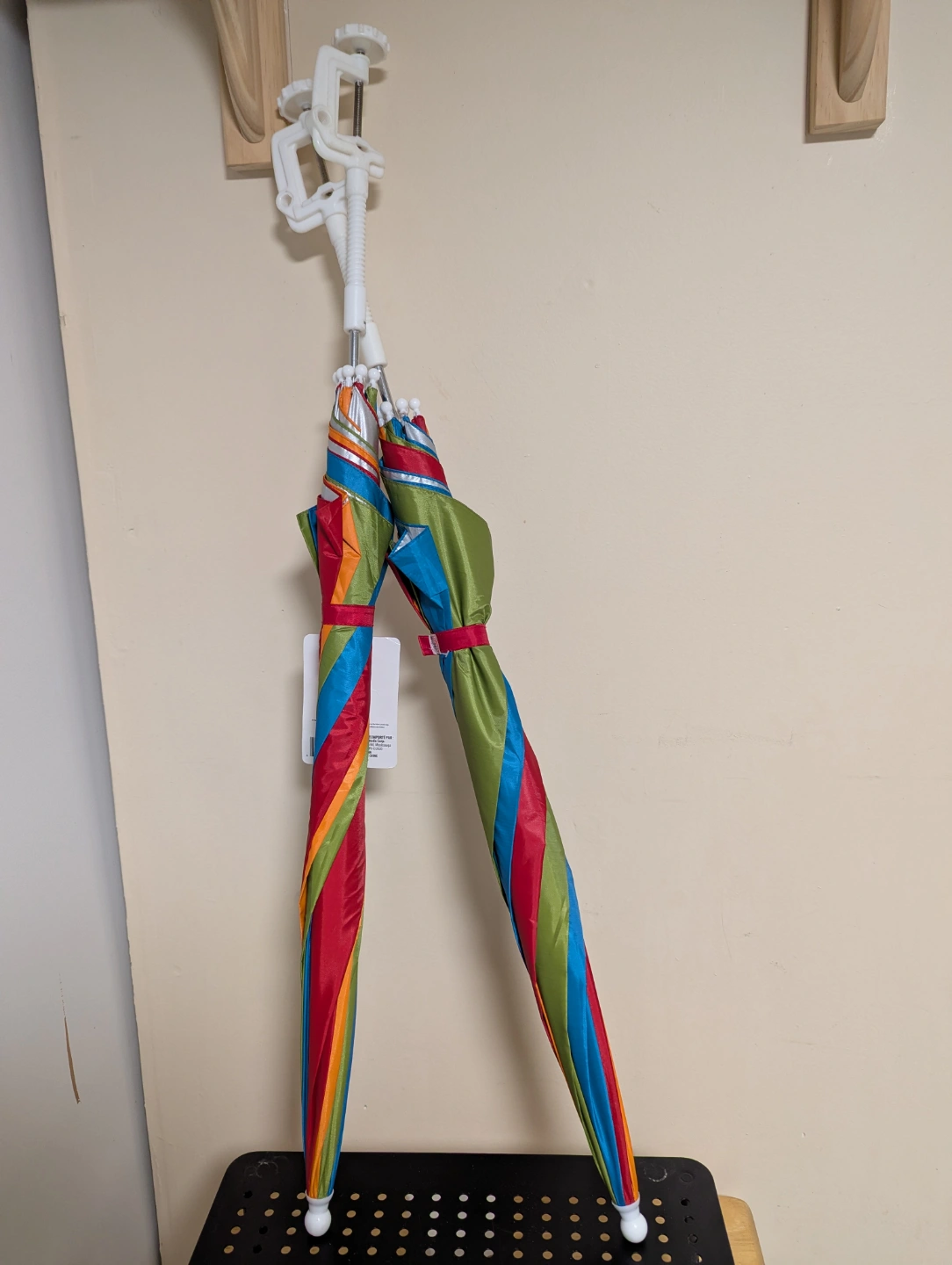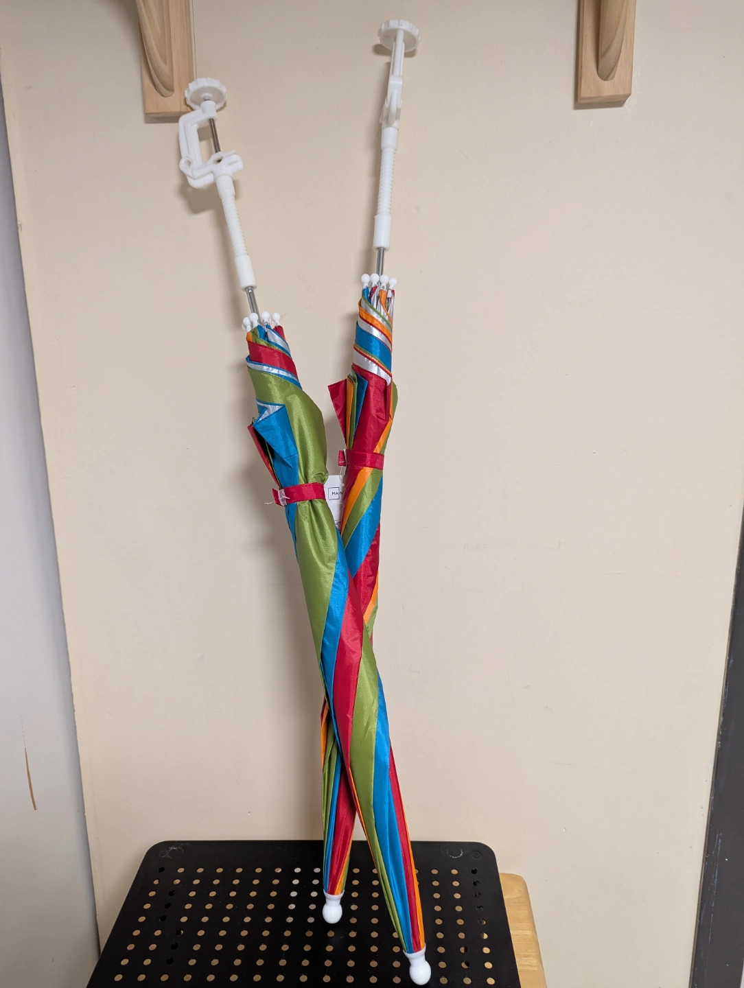 Colourful clip-on umbrellas. Multicoloured striped design. Includes clamps for attaching to surfaces.