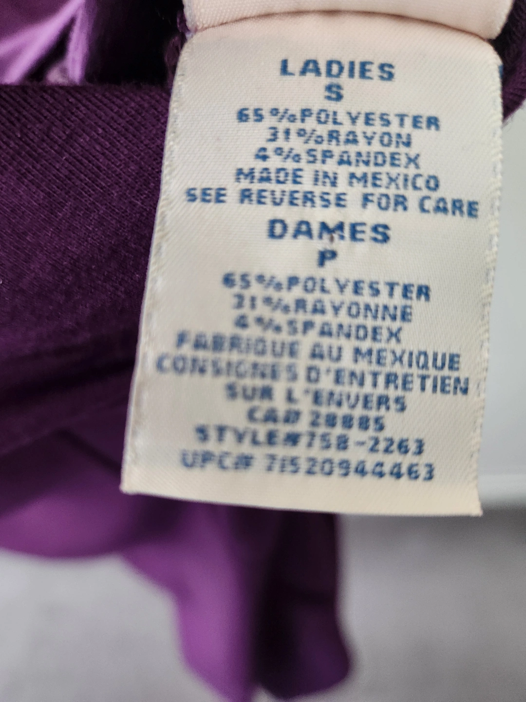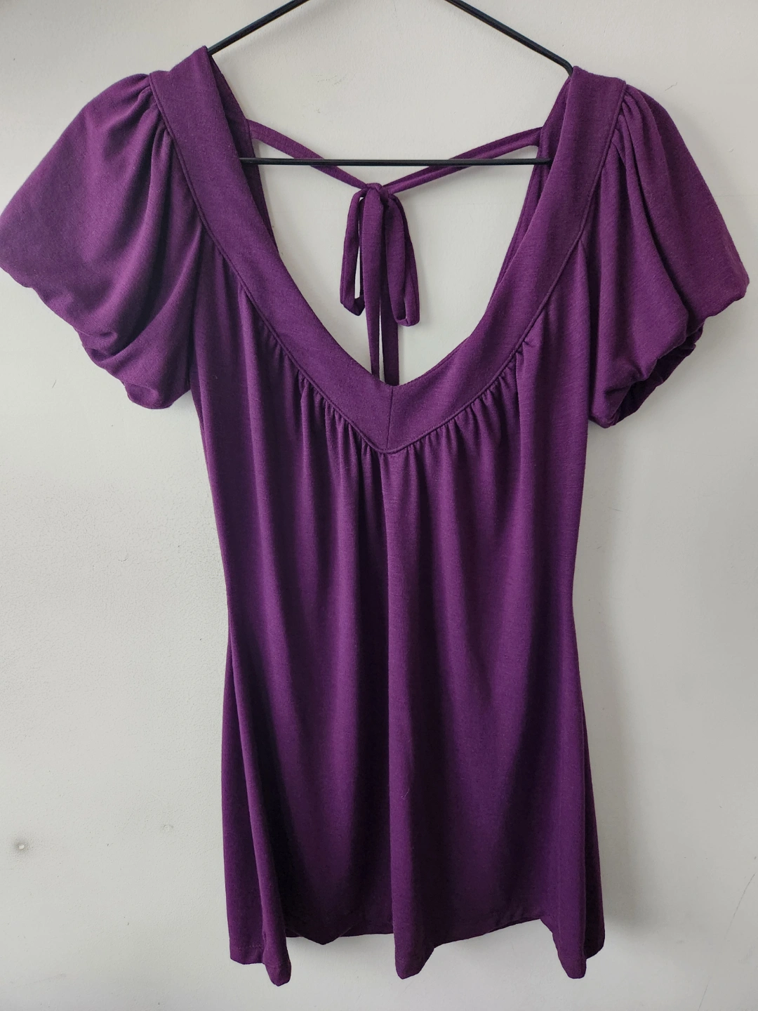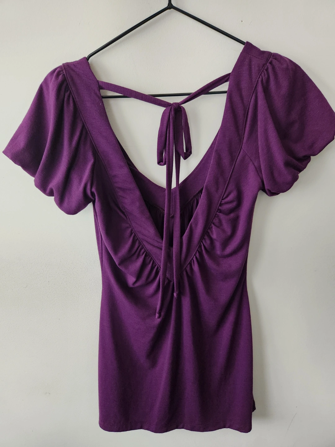 196Women's purple short sleeve top. V-neckline with tie detail at the back. Made in Mexico. Size small. 65% polyester, 31% rayon, 4% spandex.