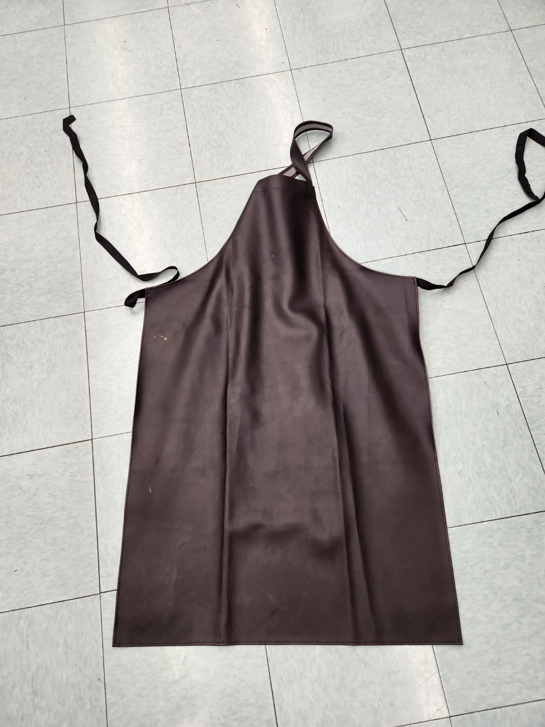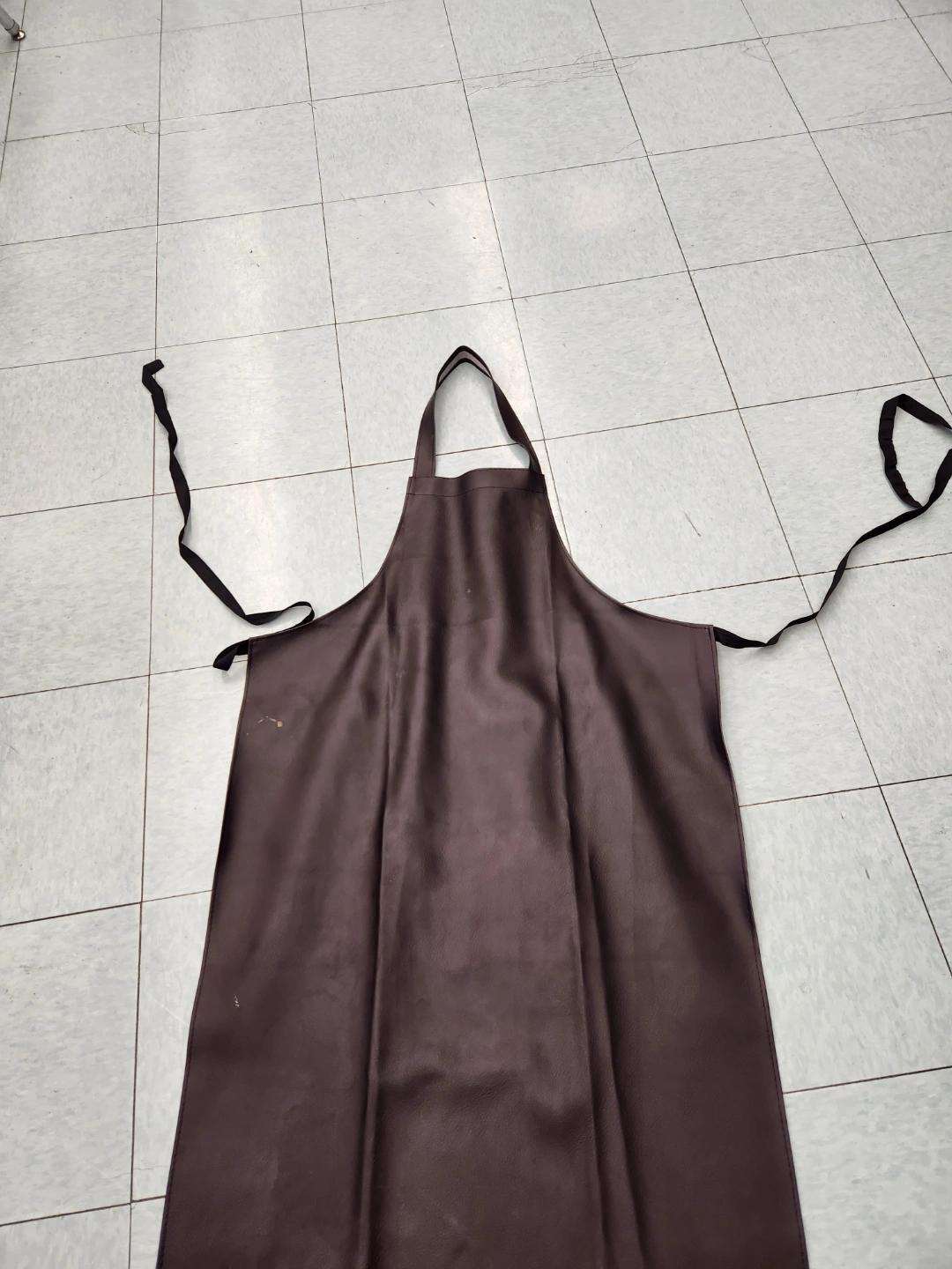 Durable brown leather-like apron. Long straps for tying. Good for work or kitchen use. Some minor markings on the side. I don't use it but it's a sturdy easy to clean apron in search of a new home.