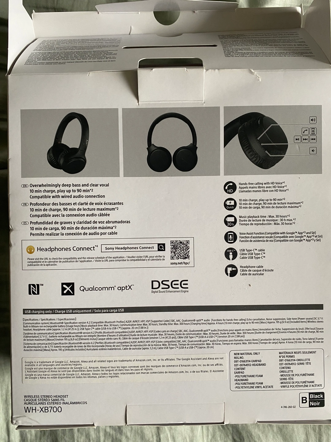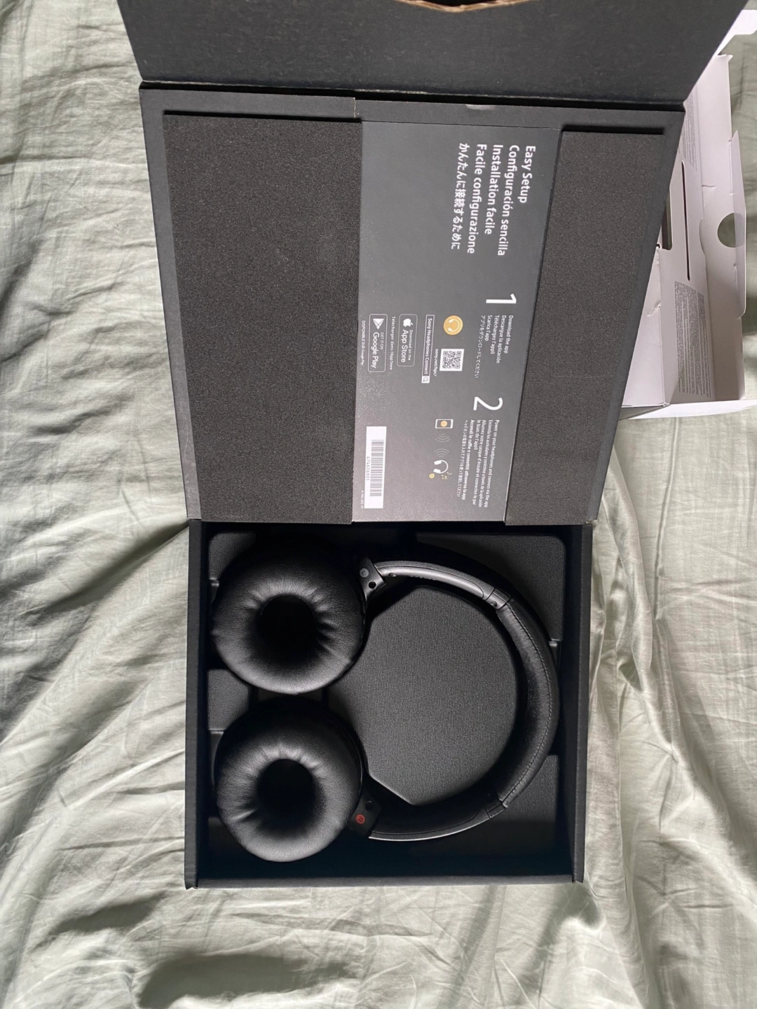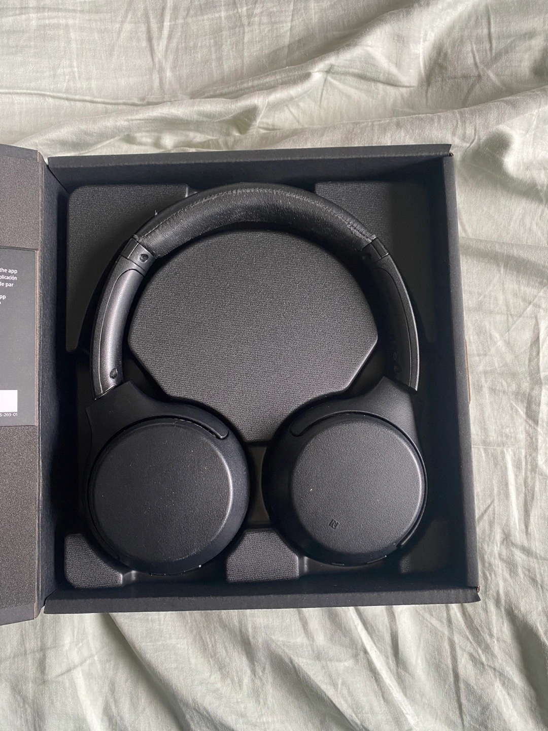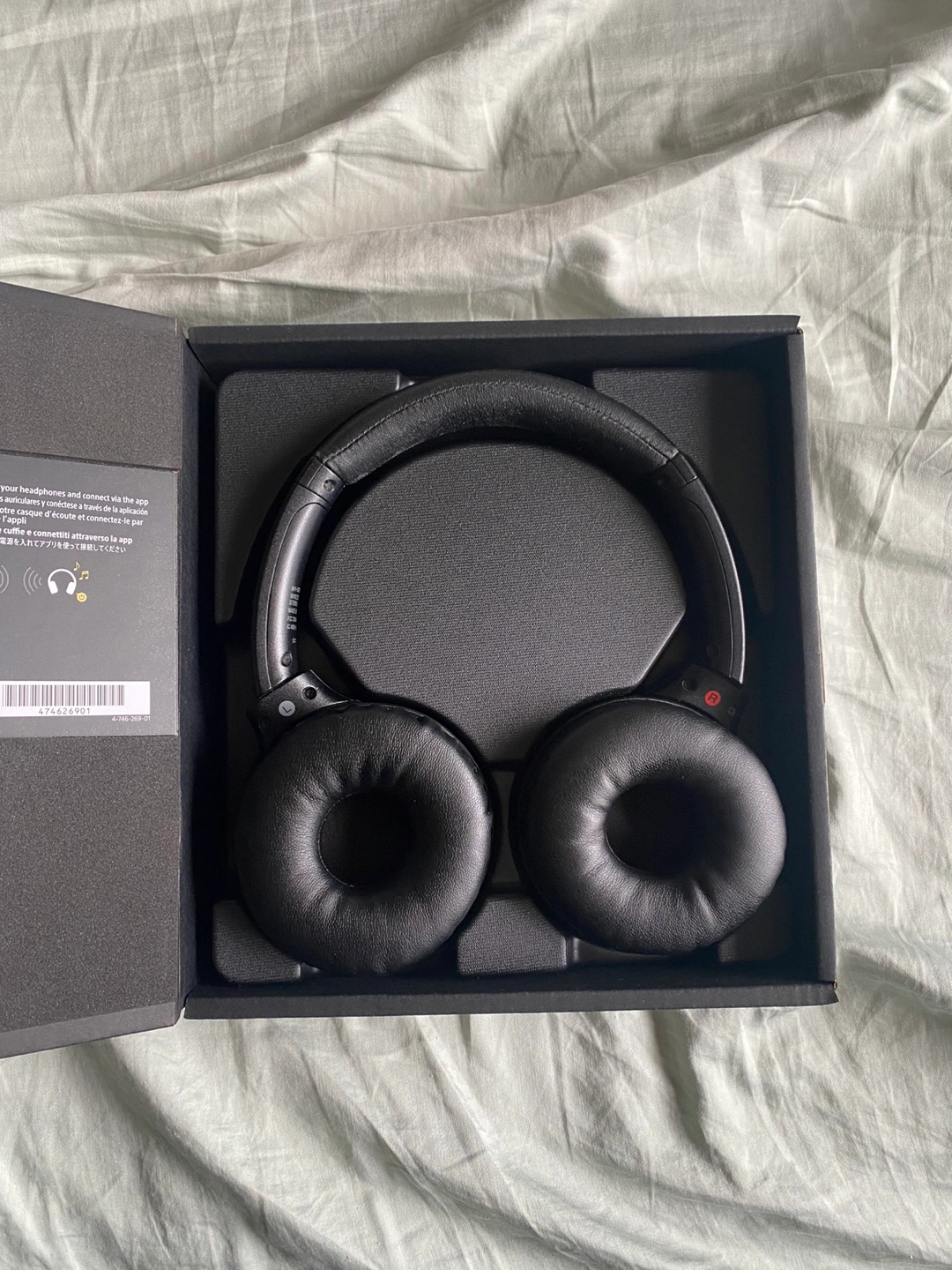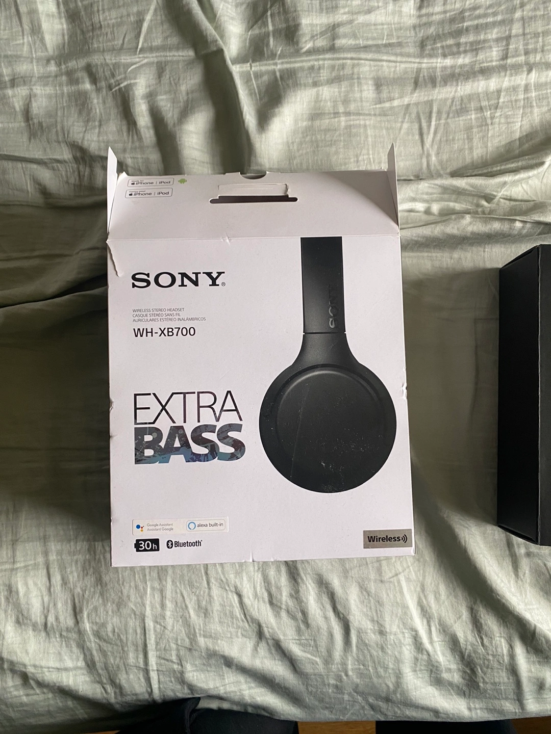Wireless stereo headphones. Extra bass. 30 hours of playtime. Bluetooth enabled, in box.